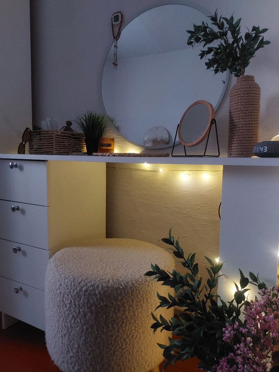 Если вы тоже хотите недорогой макияжный стол, то это можно легко осуществить самой! Всего лишь нажав кнопочку "купить" на вб. А мы то уж знаем, один клик и всё уже куплено и деньги улетели:) Но это не только так просто, но ещё и недорого! В конце скажу на сколько мне всё это обошлось и оставлю артикулы. Ни маркетплейс, ни товары не являются рекламой, чисто мой отзыв! Итак, что я для этого заказала: Комод имеет несколько (4) выдвижных ящиков, что очень удобно для хранения косметики и уходовых средств. И так же по краям тоже есть полочки, где так же можно хранить вещи. Ручки заказаны отдельно: Плюс зеркало, там должна быть подсветка прям как из пинтерест), но пока она ещё не заказана. Пуфик удобный и мягкий Маленькое зеркальце И всё обыграно гирляндой и декоративными подставками Особенно вечером это выглядит о-о-о-чень эстетично и уютно✨ Итак, всё это мне обошлось примерно~9000р. Как думаете, не дорого? Артикулы: Ручка мебельная: 296487645 Стол: 222289716 Зеркало настольное (мален