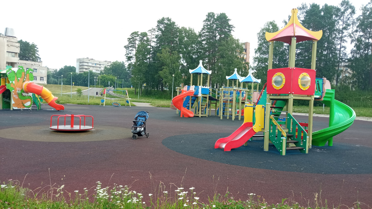 Выбежать-то выбежали. Да тут нас реальность и накрыла. Асфальт-то мокрый!Ночью ливень был. Соответственно и площадка мокрая будет. Но понадеялись на то, что площадку с самого утра солнышко освещает и не всё так грустно-печально будет.