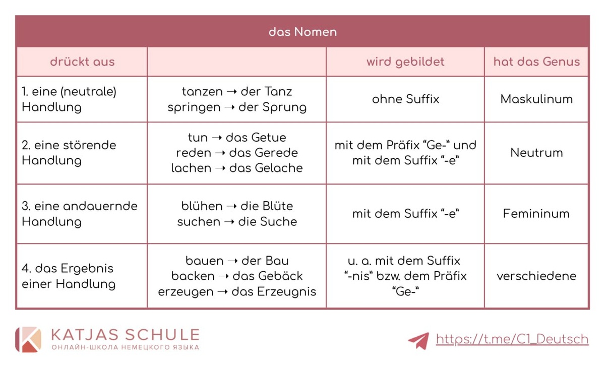 der Tanz или das Tanzen? 🤔 На B2-C1, когда появляются задания на перестраивание структуры предложения из номинальной (с существительным) в вербальную (с глаголом) и наоборот, мы сталкиваемся с тем, что от одного глагола можно построить несколько существительных с разным значением. Например: Ich sehe meiner Mutter zu, während sie zeichnet. – Я наблюдаю за мамой, пока она рисует. ➡ Ich sehe meiner Mutter zu... beim Zeichnen? bei der Zeichnung? Как дальше? Мы собрали в табличке разные способы построения существительных и различия между ними. 1⃣ Если мы говорим о действии нейтрально, можно взять бессуффиксный способ образования существительного: tanzen ➡ der Tanz fliegen ➡ der Flug И в 99% случаев, за редкими исключениями, такие слова будут мужского рода. 2️⃣ Если это какое-то противно-мешающее действие, можем взять приставку Ge- и суффикс -e: zanken ➡ das Gezanke reden ➡ das Gerede И выбираем средний род. Обратите внимание, что это лишь одно из возможных значений таких существительн