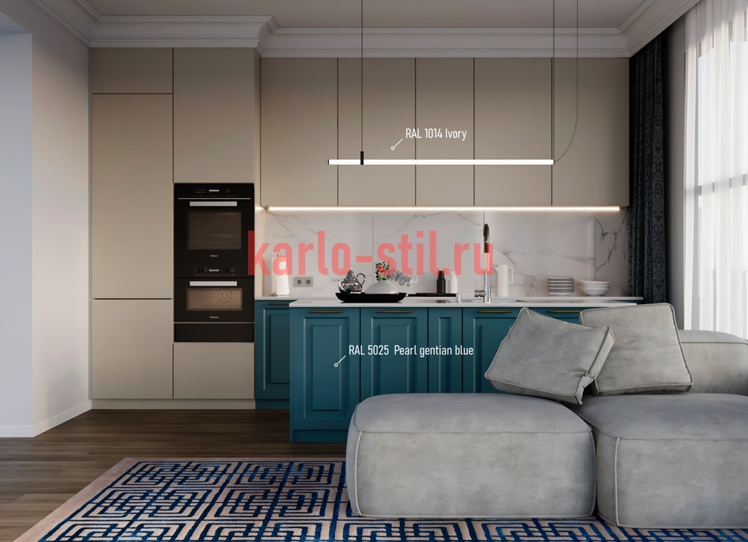Кухня с фрезерованными фасадами из МДФ в матовой эмали в цветах RAL1014 Ivory и RAL 5025 Pearl gentian blue: стиль и элегантность в каждом д