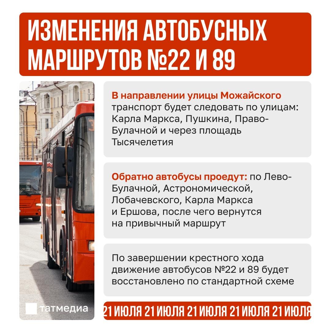В ответ на пост 🔀🚌 Друзья, напоминаем, что 21 июля в Казани временно изменятся маршруты двух автобусов Помимо общественного транспорта, с 7:00 будет ограничего движение автомобилей. По завершении крестного хода движение автобусов №22 и 89 будет восстановлено по стандартной схеме. @tatmediaofficial | Все каналы Татмедиа