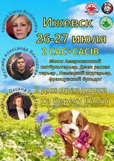 ⏰ 26 - 27 июл (7д) 🏛 #Ижевск #Россия #Выставка 🐶 Выставка собак: Летний Триумф 🏆 Республиканский Кинологический Центр Удмуртии Контакты организаторов здесь: 🌐 https://www.petsman.ru/vystavki-sobak.php?mesto=125-izhevsk 1) Международная выставка собак ранга CACIB-IKU Летний Триумф 2) Национальная выставка собак ранга CAC-IKU Летнее приключение 3) Всероссийская выставка собак ранга САС IKU Звёздные Встречи 4) Монопородная выставка породы американский питбультерьер 5) Монопородная выставка собак ранга CAC-IKU породы французский бульдог 7) Монопородная выставка породы немецкий ягдтерьер 8) Монопородная выставка породы джек рассел терьер 🧑 👨 Эксперты: 🔹 Александр Музгаев 🔹 Елена Тишина 🔹 Оксана Солдатова