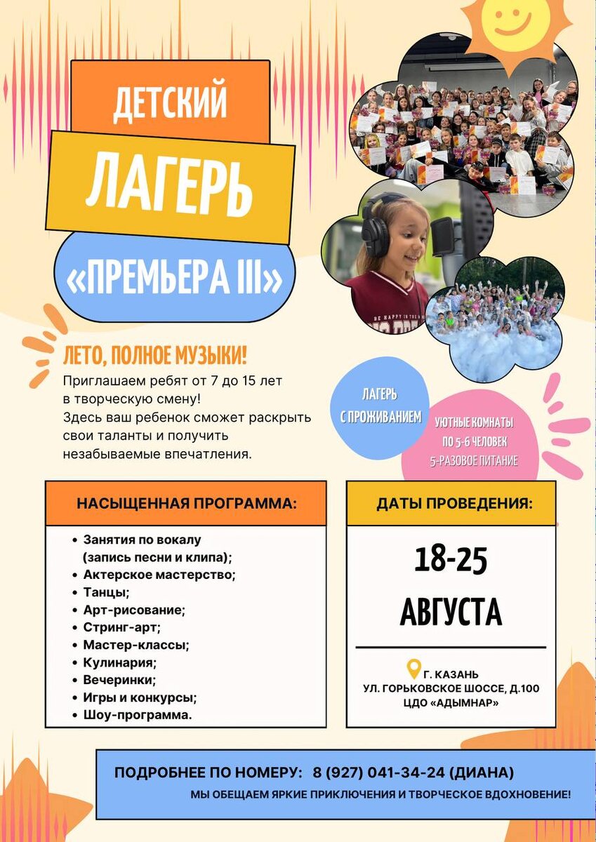 Diana 🎤 (@Diana_Gainullina) III творческая лагерная смена "Премьера" – где рождаются звезды!⭐️ Ваш ребенок мечтает о сцене? Хочет раскрыть таланты и провести лето с пользой? Тогда наша смена – идеальный выбор! Дарите ребенку незабываемое лето, наполненное творчеством, развитием и радостью!🌟 📅 Даты:18–25 августа 2025 года 📍 Место:ЦДО «Адымнар», Казань, ул. Горьковское шоссе, д. 100 👧 Возраст:7–16 лет Почему родители выбирают нас? 🔥 Не просто лагерь – а настоящая творческая школа! 🎤 Вокал, танцы, актерское мастерство– даже если ребенок никогда не занимался, он уедет с новыми навыками! 💖 Особый подход к каждому– комфортная среда для раскрытия потенциала. 🛡 Безопасность и забота– охрана, видеонаблюдение, уютные номера и 5-разовое питание. Что ждёт вашего ребёнка? ✅ Съемки клипов и выступления– почувствует себя настоящим артистом! ✅ Мастер-классы от профессионалов– вокал, хореография, сценическая речь. ✅ Творческие вечера, квесты, дискотеки– море эмоций и новых друзей! ✅ Яркий