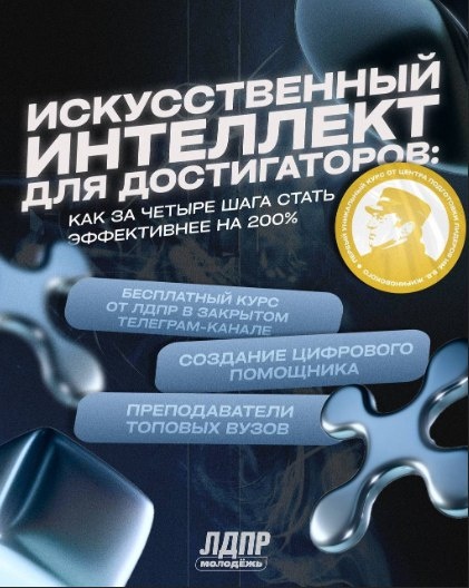 Молодёжь ЛДПР запускает бесплатный курс по нейросетям 🤖 «ИИ для достигаторов: Создай своего цифрового двойника и делегируй задачи за 4 шага» Нейросети развиваются, а использовать их на максимум мы научим тебя в рамках Центра подготовки молодых лидеров им. В.В. Жириновского. 🧠 С помощью 4 учебных треков ты освоишь всё: от базы до полной настройки ИИ под повседневные задачи. Преподавателями станут практикующие эксперты из ведущих вузов, которые поделятся не только теорией, но и реальными кейсами, чек-листами и инструкциями. Мы разберём самые мощные инструменты: GPT, Gemini, Grok, Sora, DALLE и другие, чтобы ты знал, как использовать их для своих задач. 🌟 Главная цель — создать персонального цифрового двойника, который работает в твоём стиле и помогает 24/7. Также научим интегрировать ИИ с Google Calendar, Notion, Outlook и другими сервисами. Регистрируйся, чтобы попасть в закрытый Телеграм-канал! Ссылку найдешь в комментариях 👇