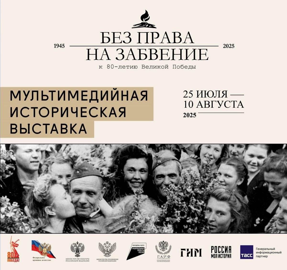 25 июля в историческом парке «Россия — моя история» стартует мультимедийная выставка «Без права на забвение. К 80-летию Великой Победы». Экспозиция создана на основе архивных документов, музейных материалов и редких артефактов из главного выставочного проекта страны, подготовленного по поручению Президента РФ.