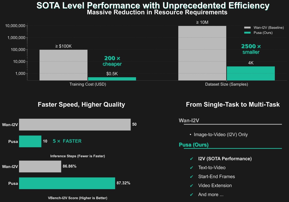 Pusa-VidGen Исследователи представили Pusa — модель диффузии для генерации видео, которая использует подход с векторизованными временными шагами вместо традиционных скалярных. 🔘Что такое Pusa? Pusa (от китайского "Тысячерукая Гуаньинь") — это парадигмальный сдвиг в моделировании видео-диффузии через покадровый контроль шума с векторизованными временными шагами. 🔘Впечатляющие результаты Pusa V1.0 Эффективность: - Превосходит Wan-I2V-14B при 1/200 стоимости обучения ($500 против $100,000) - Обучается на датасете в 1/2500 раз меньше (4K против 10M образцов) - Достигает VBench-I2V score 87.32% (против 86.86% у Wan-I2V-14B) 🔘Ключевые возможности Мультизадачность - Text-to-Video — генерация видео из текста - Image-to-Video — анимация статичных изображений - Start-End Frames — создание видео между ключевыми кадрами - Video Extension — продление существующих видео - Video Transition — плавные переходы между роликами 🔘Архитектура Vectorized Timestep Adaptation (VTA): - Покадровый к