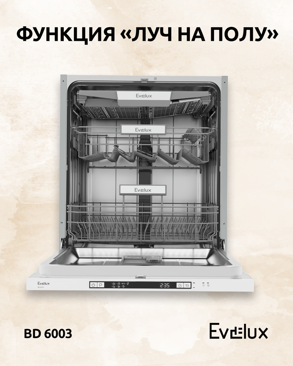 Хотите легко контролировать процесс мойки посуды, не открывая дверцу посудомоечной машины? Встраиваемая техника всегда скрыта за фасадом, дверца приглушает звуки, поэтому сложно понять, работает ли посудомоечная машина. С функцией «Луч на полу» достаточно просто взглянуть на пол: если свет горит — мойка идёт, если нет — посуда уже чистая. Подобрать посудомоечную машину Evelux с этой функцией вы можете по ссылке: https://clck.ru/3N6uKc