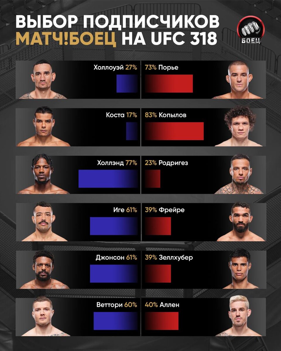 Порье заберет трилогию с Холлоуэем, а Копылов разберется с Костой ⚔ Наши подписчики прикинули расклады на UFC 318. Мы зафиксировали ✍️ Теперь ждем бои. Встречаемся в 1:00 на Матч! Боец. ССЫЛКА НА ТРАНСЛЯЦИЮ 👈