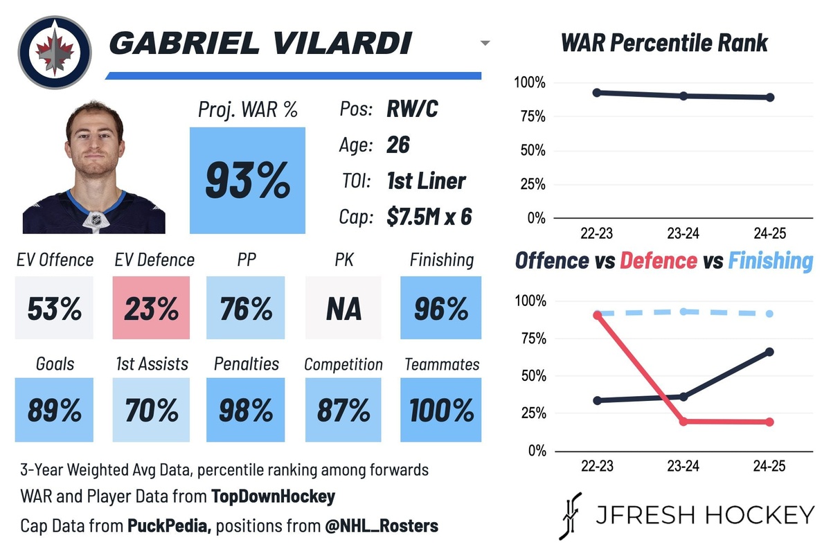 ✈️ Новый контракт Габриэля Виларди 6 лет по 7,5 млн — хорошие условия, когда речь идёт о форварде 25 лет, способном играть как в центре, так и на правом краю нападения, только что набравшем 61 балл в 71 игре. На бумаге всё выглядит просто замечательно. Однако не всё так хорошо: 1. Гэйб Виларди — очень травматичный игрок. Из 204 возможных игр в ОХЛ (за три сезона, что он там провёл) сыграно 123. В АХЛ сыграно 32 (+10 в НХЛ) из 68 в сезоне 2019-20. В НХЛ из 384 возможных сыграно 260, начиная с сезона 2020-21, когда игрок перестал уезжать в АХЛ. Итого пропущено 124 игры — полтора сезона из пяти полноценных, если для Виларди термин "полноценный сезон" вообще уместен. 2 «Джетс» очень рискуют, давая форварду такой контракт. Виннипег — не то место, куда хоккеисты стремятся. Очередь на релокацию туда не стоит. Более того, город из года в год занимает первое место в опросе игроков НХЛ, когда их спрашивают "где бы вы не хотели жить и играть". Из предыдущего утверждения следует, что клуб выну