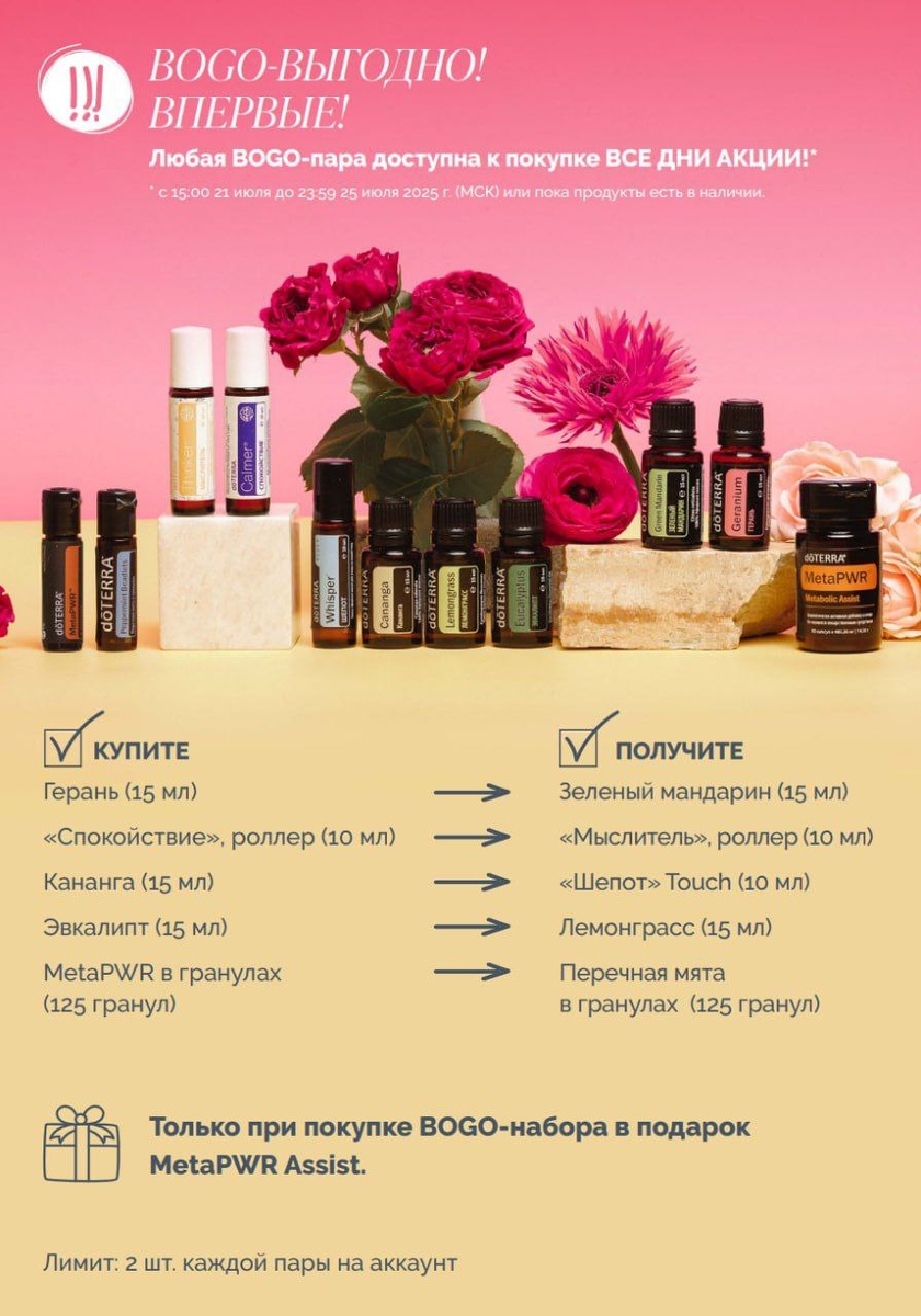 💥💥💥Мы ждали этого!!! Летняя BOGO-акция (21–25 июля) — 5 пар масел и супер-набор! Что это за акция? Это когда берешь одно масло, а второе получаешь в подарок🥳 И какие в этот раз прекрасные пары! И для взрослых, и для детей. Читайте внимательно, чтобы не пропустить и не упустить. Всё доступно все дни, так что можно успеть собрать свой летний must-have. Как думаете, какие пары будут самыми популярными? Пара 1: Герань 15 мл + Зелёный мандарин 15 мл (в подарок) 🌸 Герань — масло красоты и гормонального баланса. Помогает коже (ранки, высыпания, сухость), поддерживает женское здоровье, снимает раздражение. В диффузоре — успокаивает и даёт чувство гармонии. 🍊 Зелёный мандарин — мягкое цитрусовое масло для энергии, лёгкости и пищеварения. Работает мягко, подходит детям, освежает воздух и настраивает на позитив. 💰 Цена: 5 140 руб Экономия: 4 500 руб Пара 2: Смесь «Спокойствие» (роллер) + Смесь «Мыслитель» (роллер в подарок) - это смеси из детской коллекции, но и взрослые их очень лю