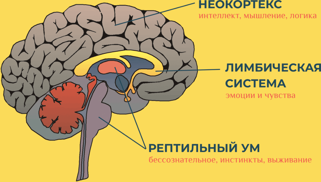 Наша психика - это высокоорганизованная живая материя и до конца не исследована. Но, что науке известно уже точно: ✅ мозг эволюционирует; ✅ у каждого отдела мозга свои функции; ✅ каждый отдел мозга взаимосвязан и является лишь частью сложной системы. Если не углубляться в сложные понятия, то мозг можно разделить на три составляющих, представленных на рисунке. Рептильный ум был сформирован раньше, в процессе эволюции добавилась лимбическая система и неокортекс. Рептильный ум отвечает за инстинкты, нашу способность к выживанию. Когда мы случайно дотрагиваемся до раскалённой сковороды, именно он даёт сигнал, одернуть руку. А вот мысли и эмоции по поводу случившегося включаются потом. Что случится, если последовательность будет нарушена? Мы станем беззащитными перед внешней средой. Лимбическая система даёт нам эмоции и чувства. Она нужна для того, чтобы мы не просто смогли выжить, но ещё и получать удовольствие. Социализироваться. Неокортекс же эволюционировал самым последним. Грубо говор