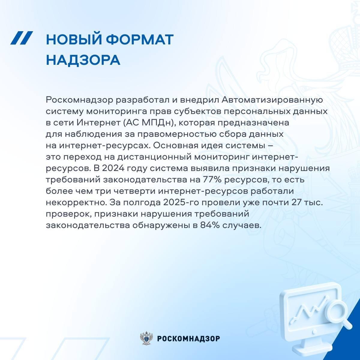 Помню, не так давно, некоторые коллеги уверяли, что становиться оператором персональных данных не надо, все это ерунда... Ну кто не стал, можете готовиться к проверкам, создана Автоматизированная система мониторинга прав субъектов персональных данных в сети Интернет (АС МПДн) и уже во всю проверяет и выявляет нарушения. Подробней все, что касается ведения генеалогического бизнеса, новости сферы и что на нее влияет, ценообразование, лайфкаки в генеалогии рассказываю в чате "Цифровая настольная книга генеалога", кто хочет вести бизнес правильно и уважительно к заказчикам и коллегам, или понять почему исполнители столько берут, или как провести сложное исследование - пишите в бота обсудим добавление в чат. Источник новости: Роскомнадзор РФ ➿➿➿➿➿➿➿➿➿➿ 🔗Ссылки на ресурсы: - Копилка знаний, именные списки к делам - Подписаться на канал - Задать вопрос или проконсультироваться