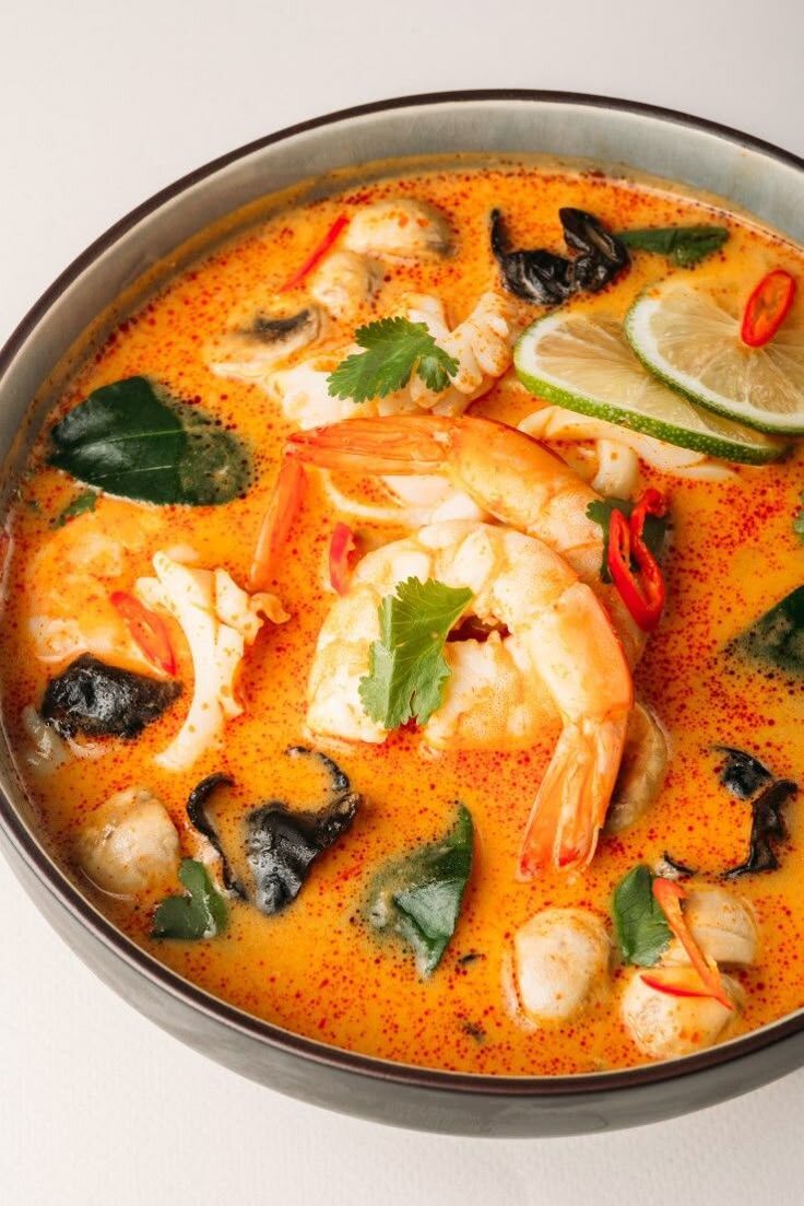 Мечтаете о настоящем тайском супе?Где кислота лайма бьет по щекам,аромат лемонграсса сводит с ума,а креветки тают во рту?Перед вами не ресторанная легенда,а домашний рецепт аутентичного Том Яма! Готовьтесь к вкусовому цунами! Философия Том Яма:Игра Контрастов! Кислый:Сок лайма,тамаринд. Острый:Чили-паста,свежие перцы. Ароматный:Лемонграсс,галангал,кафр-лайм. Умами:Рыбный соус,креветки. Кремовый(опционально):Кокосовое молоко. Ингредиенты(на 2-3 порции): Основа Аромата(БУКЕТ!): Лемонграсс(стебли) – 2 шт.(нижнюю часть смять ножом!) Корень галангала – 3-4 ломтика(не имбирь!) Листья кафр-лайма – 4-6 шт.(порвать!) Птичий глаз чили(или чили халапеньо) – 2-5 шт.(порвать/надрезать!Осторожно!) Жидкость и Кислота: Куриный/овощной бульон – 600 мл Сок лайма – 3-4 ст.л.(свежий!) Рыбный соус – 2-3 ст.л. Начинка и Белок: Креветки(крупные,очищенные) – 200-250 г Шампиньоны/вешенки – 100 г(пластинками) Помидор черри – 8-10 шт.(пополам) Огонь и Крем(опционально