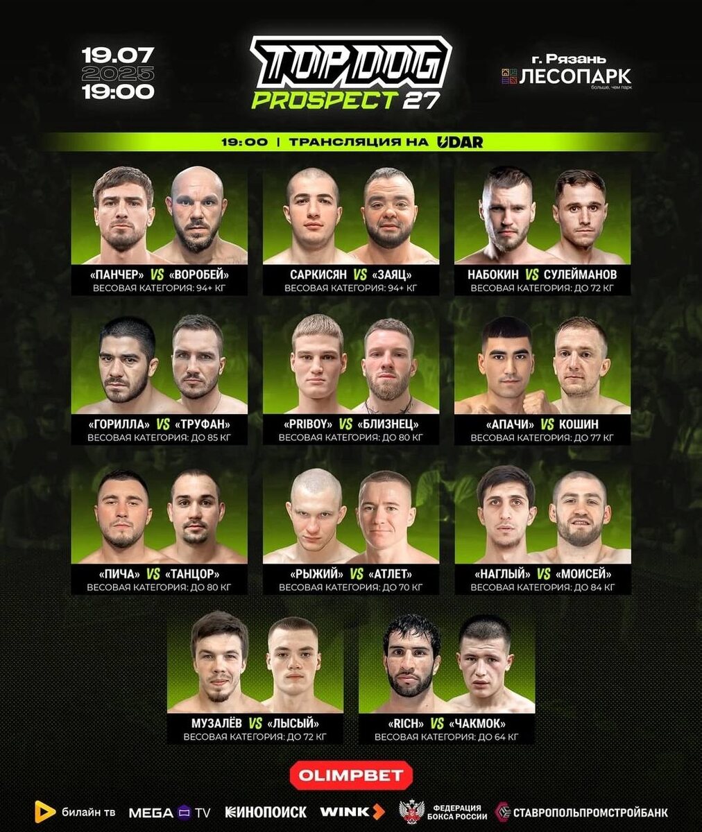 Кард турнира TOP DOG: PROSPECT 27 Сегодня! Начало прямого эфира в 19:00 по Москве! Где смотреть ❓⬇ Видеосервис Wink - wink.ru/tv/udar Кинопоиск - hd.kinopoisk.ru/channels?c... Билайн ТВ - beeline.tv/ НТВ-ПЛЮС - ntvplus.tv/channel/udar-681 🇺🇿 Телеканал UDAR в Узбекистане TelecomTV - telecomtv.uz 🇧🇾 Телеканал UDAR в Республике Беларусь KOT TV - www.kottv.by/ 🇧🇾 Телеканал UDAR в Республике Беларусь T1-Групп - t1group.by/ 🇰🇿 Телеканал UDAR в Казахстане - Кинопоиск подписка Яндекс Плюс - раздел спорт hd.kinopoisk.ru/sport/ 🇰🇿 Телеканал UDAR в Казахстане Alma TV- www.almatv.kz/tarify/ 🇰🇬 Телеканал UDAR в Киргизии MEGA TV - megacomtv.kg/ 🇰🇬 Телеканал UDAR в Киргизии O! TV - otv.kg/channel/64... 🇦🇲 Телеканал UDAR в Армении - wink.am/tv