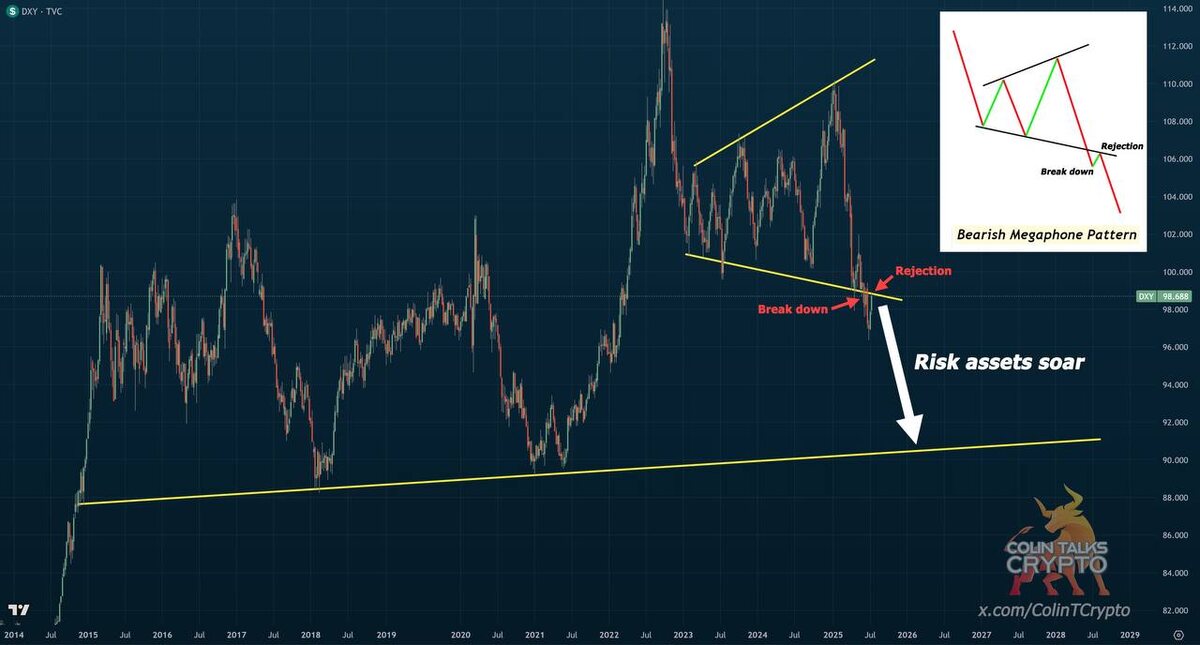 DXY падает. Рискованные активы готовятся к взлёту? Долларовый индекс ($DXY) пробил ключевую поддержку вниз, оттестировал её снизу — и оттолкнулся. Это называется “underside retest” после пробоя из медвежьего мегафона — редкая, но сильная разворотная структура. Цель по паттерну — зона 90.6. И если туда действительно пойдём — нас ждёт настоящий праздник на крипторынке и фондовом. Почему это работает? Когда доллар слабеет по отношению к другим валютам — деньги бегут туда, где больше риска и потенциала. Это значит: — крипта получает импульс ликвидности — биткоин и альты растут вместе с акциями — фондовый рынок ловит второе дыхание — капитал начинает «искать прибыль», а не «прятаться в безопасности» Так уже было в 2020, 2017, 2010. Доллар падает — рынок стреляет. На что стоит обратить внимание? 1. Пока DXY не вернётся выше пробитой линии — сценарий остаётся медвежьим для доллара 2. Пауэлл на следующем заседании может только усилить этот тренд, если риторика сместится в сторону смяг
