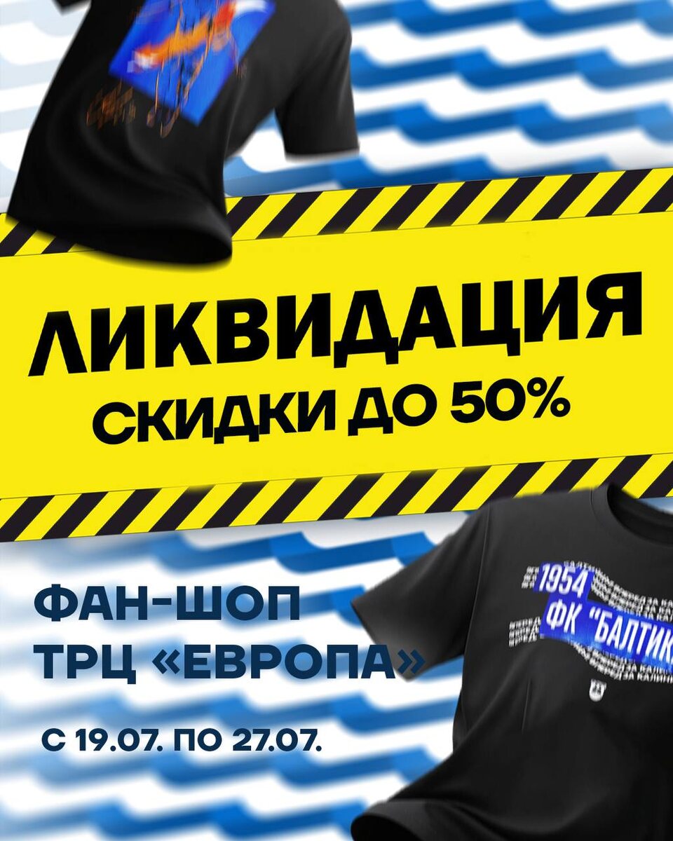 ФИНАЛЬНАЯ РАСПРОДАЖА 💙 ⠀ В связи с приближающейся реконструкцией 3-го этажа ТРЦ «Европа» мы вынуждены закрыть фан-шоп и объявляем финальную распродажу: Скидка до 50% на всю старую коллекцию! 🔥 ⠀ Отличная возможность забрать любимые вещи по выгодной цене — успей до закрытия! ⠀ 📍 ТРЦ «Европа», 3 этаж 📆 Акция действует только в «Европе» с 19 по 27 июля ⠀ Фан-шоп в ТРЦ «Европа» работает до конца июля. Ждём вас! Напомним, что в мае ФК «Балтика» открыл новый магазин по адресу ул. Октябрьская, д. 12 (со стороны дороги, ост. Набережная Ветеранов). ⏰ График работы фан-шопа: Пн-Чт: с 10:00 до 21:00 Пт-Вс: с 10:00 до 22:00