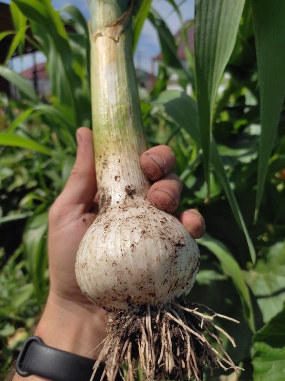 Ранний урожай крупного порея в июле, июне или даже в мае - оказывается реально! Для этого всего лишь нужно... посадить его на год раньше) В общем, в прошлом году при сборе порея осенью решил попробовать оставить несколько некрупных экземпляров в земле. И вот что из этого получилось; Из 6-7 штук успешно перезимовали 4 (загнулись самые чахлые и тонкие). В конце марта в начале апреля их перьям начал возвращаться зелёный оттенок, затем появились молодые листочки. В мае уже и ножки выживших окрепли и даже немного визуально прибавили в весе. В июне ножки ещё незначительно увеличились, а сами растения пустили стрелки. Все это время я не выкапывал прошлогодний порей, но, с удовольствием срезал зелёные перья - они отлично подходят для приготовления мясных бульонов и заготовки шашлыков. Сюрприз меня ждал сегодня. Порей напрочь отказывался вылазить из земли, пришлось воспользоваться лопатой. Его подземная часть оказалась существенно толще видимой части ножки, что для порея не характерно. Любо