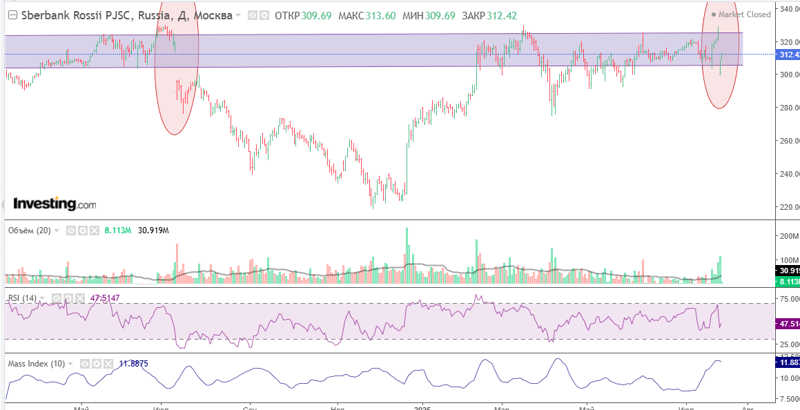 Вот вам два последних дивидендных гэпа Сбера. Давайте рассмотрим, какие засады ждут нас на этом пути и их вероятность. Во 1х, дивгэп-24 закрылся через 7мес. Только не надо говорить мне за геополитику 2024, в этом году никто геополитику не отменял и принципиально ничего не изменилось. Вот когда будут существенны, видимые глазу и устойчивые изменения в этой области - тогда и поговорим, а так - нет. Обращаем внимание, что в этом году Сбер торгуется на уровнях не выше весны-начала лета 2024го года, даже чуть ниже. И не надо мне рассказывать, что в долларах он подорожал. Я знаю за приключения пары рупь/бакс в этом году. Как по мне, так баксу путь скорее вниз, чем вверх, "но это неточно"ц, и мы, вообще-то, живём в рублевой зоне. От того, что Сбер подорожал в баксах мне ни холодно, ни жарко. А вот пара-тройка нехороших признаков - есть. Во 1х - смотрите на объёмы торгов: Они плавно, но неуклонно снижаются. А падение спроса можно расценить как предвестник снижения цены. Во 2х, индекс массы да