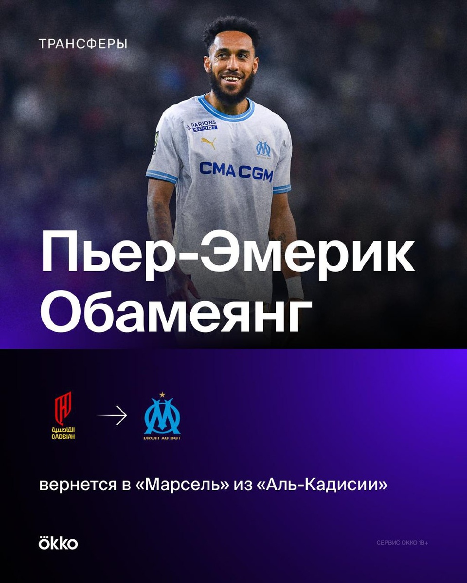 Обамеянг возвращается в «Марсель». Фабрицио Романо подтвердил ⚽️ Габонец отыграл в «Аль-Кадисии» всего один сезон. Контракт 36-летнего форварда с топ-клубом Лиги 1 будет рассчитан на два года. Забьет ли Пьер-Эмерик 20 голов в следующем сезоне? 👍 / 👎