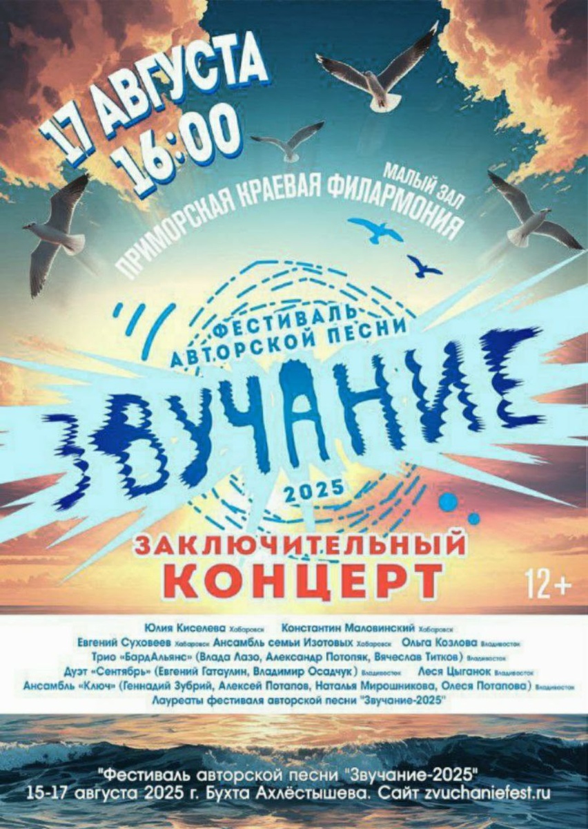 15-17 августа во Владивостоке ВПЕРВЫЕ состоится фестиваль Авторской песни "Звучание"-2025. Место проведения - остров Русский, бухта Ахлёстышева. 🌱Название мне очень нравится. Для кого- то новое, кому свежее, кому забытое звучание хорошей авторской песни. Фестиваль в этом году посвящён творчеству Булата Окуджавы, будет возможность услышать его песни и много хороших песен в исполнении ведущих авторов-исполнителей Дальнего Востока. 💫💐🔥 Заключительный концерт пройдёт в малом зале Приморской краевой филармонии 17 августа (воскресенье) в 16.00. Билеты можно приобрести на сайте филармонии. Ссылка на сайт фестиваля zvuchaniefest.ru/. Ссылка на телеграм канал t.me/zvuchanief... ❗Внимание! Для участия в том числе проживания на территории фестиваля необходимо зарегистрироваться по ссылке forms.yandex.ru/cloud/685e... 💌🌍Просьба к вам, максимально широко распространять информацию о фестивале среди своих знакомых, чтобы задуманный праздник получился масштабным и чтобы авторская песня по