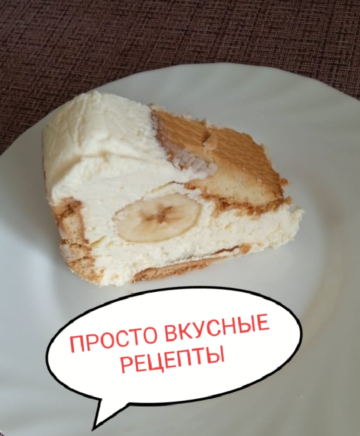 Точнее, очень вкусный десерт без выпечки. Нам понадобится: Печенье "Юбилейное" 9 штук, Масло сливочное 100 г, Творог 250 г, Сгущённое молоко 1-2 столовые ложки, Банан 1 шт, Пищевая пленка или целлофановый мешок. Приготовление. Масло нужно достать из холодильника заблаговременно, чтобы подтаяло. В чашку кладем масло и добавляем сгущёнку. Хорошо смешиваем. Я вымешивала столовой ложкой. Высыпаем творог. Перемешиваем до однородности. На пищевую пленку выкладываем 9 печенек. Сверху творожную массу. На средний ряд кладем банан. За края пищевой пленки складываем нашу конструкцию в шалаш. Хорошо утягиваем. Сдавливаем. Уплотняем. Сворачиваем плёнку конфеткой. И убираем в холодильник на ночь. Режется хорошо, не рассыпается. А как вкусно! Комментируйте, сохраняйте себе, делитесь рецептом с друзьями и подписывайтесь на канал ПРОСТО ВКУСНЫЕ РЕЦЕПТЫ.