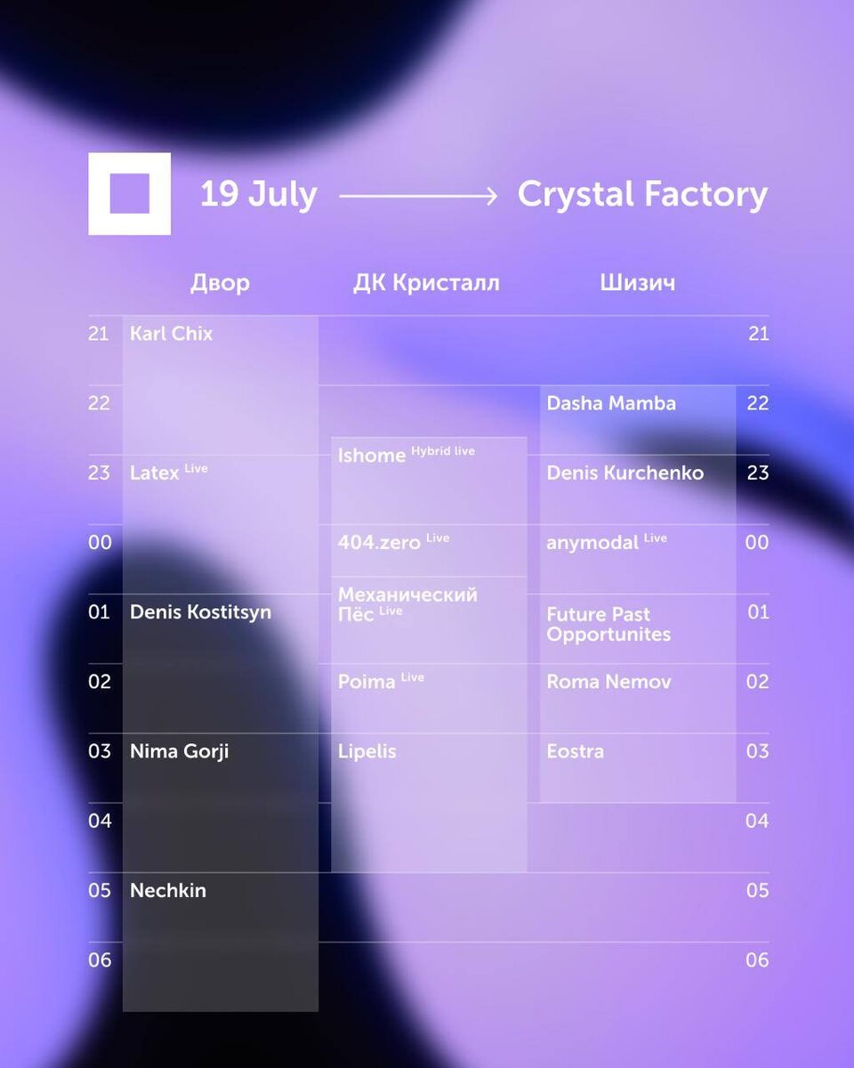 ДК КРИСТАЛЛ 19 июля | Beyond Signal: Main Event | 21:00 Signal в городе — на трех сценах завода «Кристалл». Большая встреча перед грядущим фестивалем. В программе — более 20 артистов и арт-инсталляции. Билеты — по ссылке