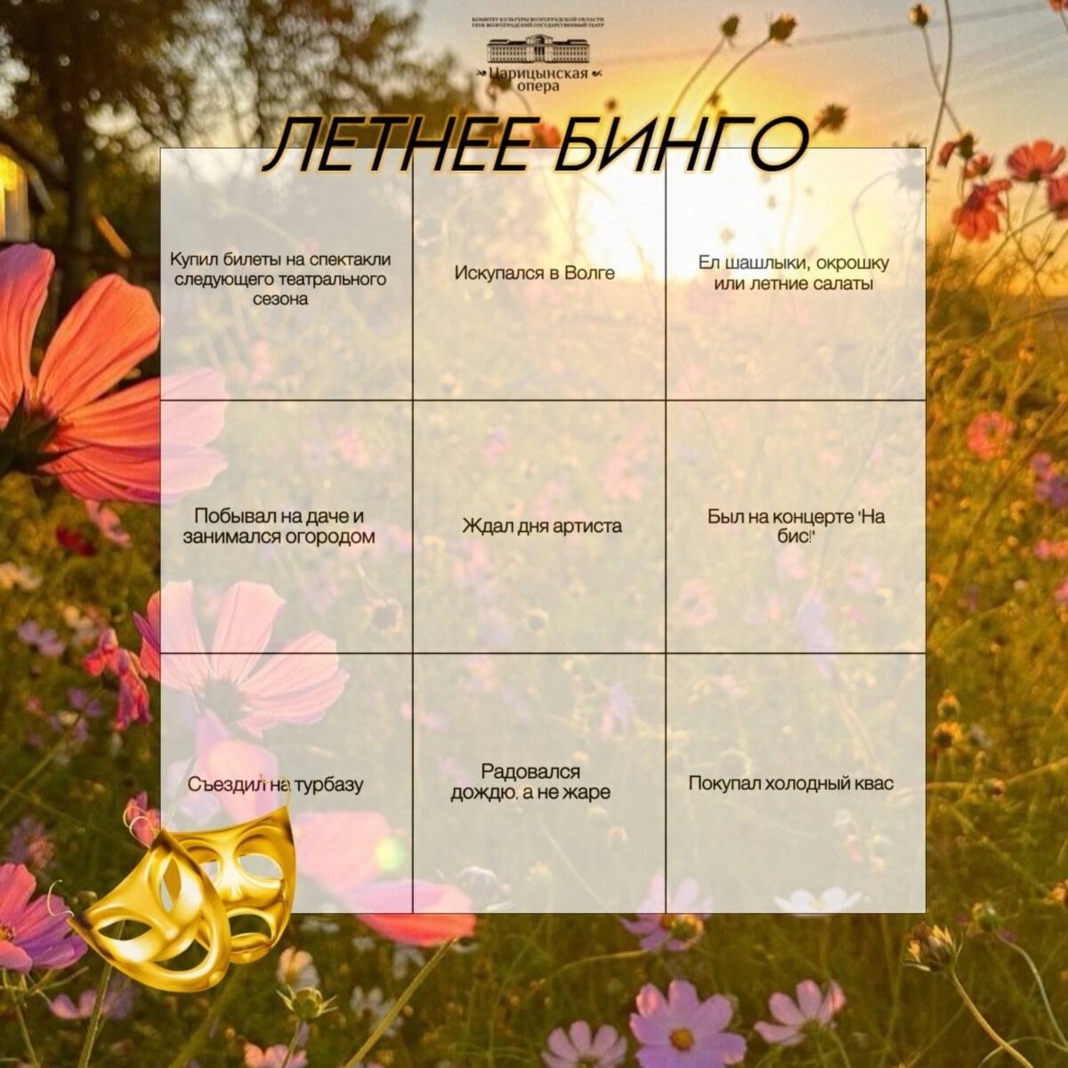 КАК ВЫ ПРОВОДИТЕ СВОЕ ЛЕТО? Театральные будни позади, а все артисты и работники театра активно отдыхают, наслаждаясь заслуженным отпуском. А как отдыхаете и проводите свое лето вы, дорогие зрители? Отвечайте на вопросы из бинго и делитесь фотографиями вашего отдыха!