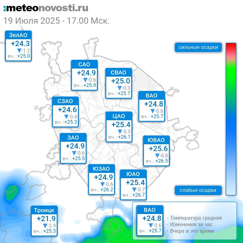 В 17:00 в Москве было от +23.7°C до +25.8°C, средняя температура +25°C #погода #Москва #лето #температура #19июля #суббота