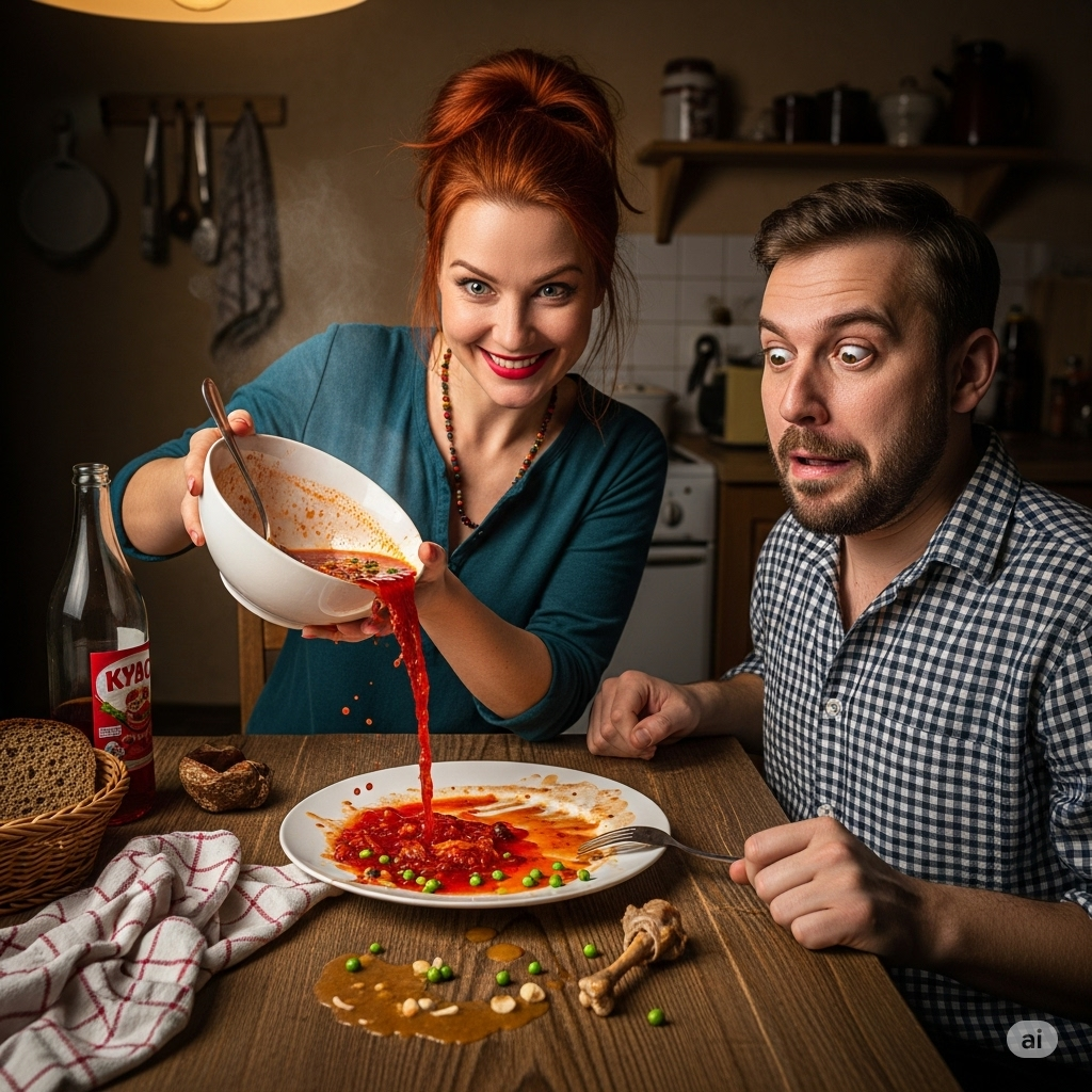 Я же, с невозмутимым видом, поставила кастрюлю на место. Взяла свою чистую тарелку, налила себе полную порцию борща, щедро добавила сметаны, взяла чесночную гренку и села напротив. «Приятного аппетита, дорогой», – сказала я и с удовольствием зачерпнула первую ложку.