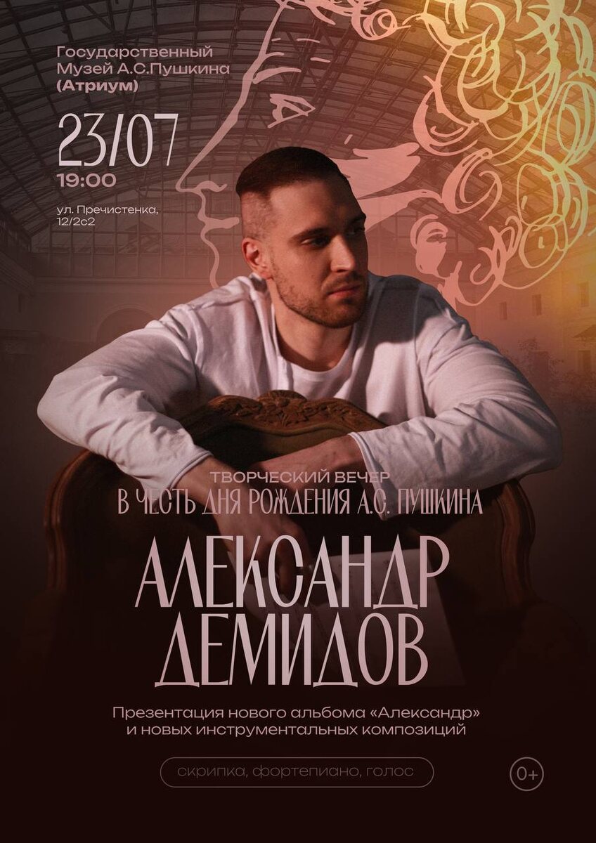 ТВОРЧЕСКИЙ ВЕЧЕР В ЧЕСТЬ ДНЯ РОЖДЕНИЯ А.С. ПУШКИНА: музыкант (скрипка, фортепиано), композитор, регент молодежных церковных хоров Александр Демидов даст уникальный концерт! 🎻 Приглашаем вас на презентацию нового альбома «АЛЕКСАНДР», которая пройдет в государственном музее А.С. Пушкина. В альбом войдут фортепианные композиции, написанные для избранных стихотворений великого поэта ко дню его рождения. Также в программе творческого вечера вас ждут самые популярные произведения композитора Александра Демидова и живая импровизация на фортепиано. Этот вечер станет уникальной возможностью погрузиться в атмосферу родной культуры, услышать любимые стихотворения и музыку, вдохновлённую шедеврами великого поэта, и отметить его день рождения в кругу ценителей искусства! 🗓 Дата и время: 23 июля (среда), начало – 19:00 👉 БИЛЕТЫ ЗДЕСЬ ❗️Промокод на скидку 20%: ПРОСМЫСЛЫ Адрес: г. Москва ул.Пречистенка 12/2с2 (ст. м. Кропоткинская)