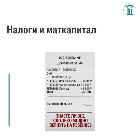 Налоговые вычеты на детей 👶 Основными налоговыми вычетами, которые родители могут заявить благодаря детям, являются: ✅️ вычет за лечение; ✅️ вычет за обучение; ✅️ вычет за лекарства. Все перечисленные вычеты относятся к социальному☝🏽 💸 Сумма расходов, заявляемая налогоплательщиком по социальному вычету ограничена лимитом - 150 тысяч рублей в год ⤵️ Максимально возможный возврат налога с этой суммы составляет 19 500 рублей по ставке 13%💰 Но если ваш доход облагается по прогрессивной ставке, то и сумма возврата будет больше! В эту сумму также входят и другие расходы родителя, если такие были - лечение, обучение, фитнес, страхование. Но вычет на обучение ребенка дает дополнительно 110.000 к лимиту (на каждого ребенка)! Нюансы каждого из вида вычета: Лечение ⬇️ 🔹 исключением является дорогостоящее лечение с кодом справки "2" - по нему можно заявить всю сумму расходов (без учёта лимита 150.000); 🔹 возврат доступен до достижения ребёнком возраста 24 лет, если он продолжает у