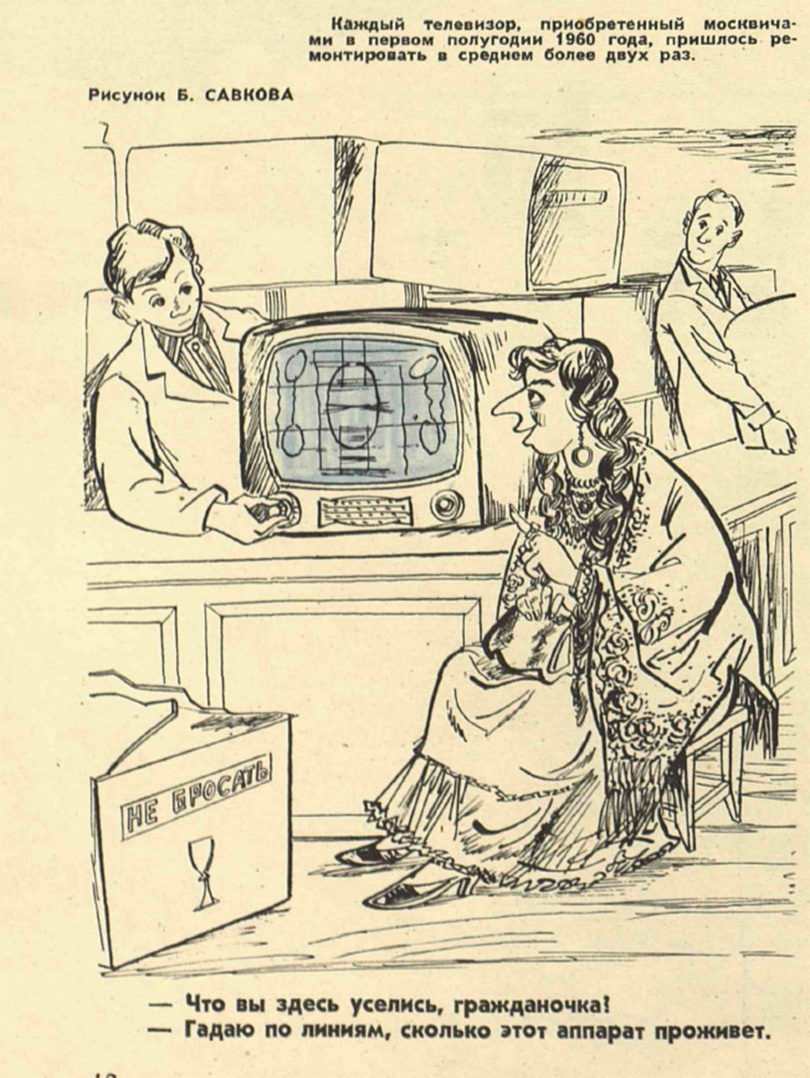 А давайте вам об этом расскажет советский журналист. Я вам сейчас процитирую статью журналиста Милецкого «Почему гаснут экраны», опубликованную в «Огоньке» №9 за 1962 год. Дело в том, что в начале 1962 года советское начальство, видимо, оценило, насколько граждан достало качество выпускаемых телевизоров, что решили выпустить пар через критическую статью в одном из самых популярных еженедельников: