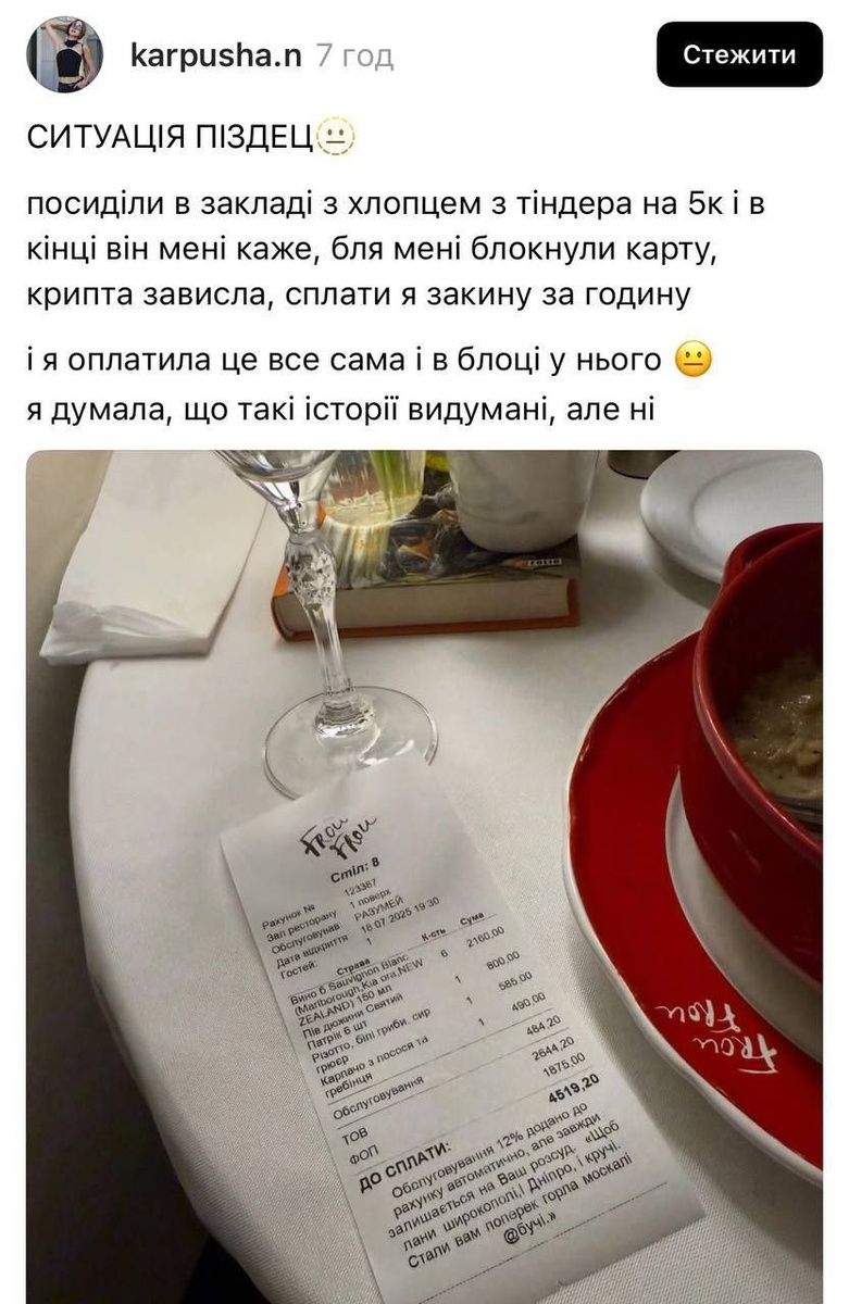 Фаст темка на 5к грн 😁 Криптан из тиндера развёл киевлянку на почти 5000 грн: парень попросил девушку рассчитаться в рестике, потому что «у него всё в крипте», а потом просто заблокировал её. Мамкины криптаны они такие) 💬Bybit (https://partner.bybit.com/b/43818) | Chat | Admin