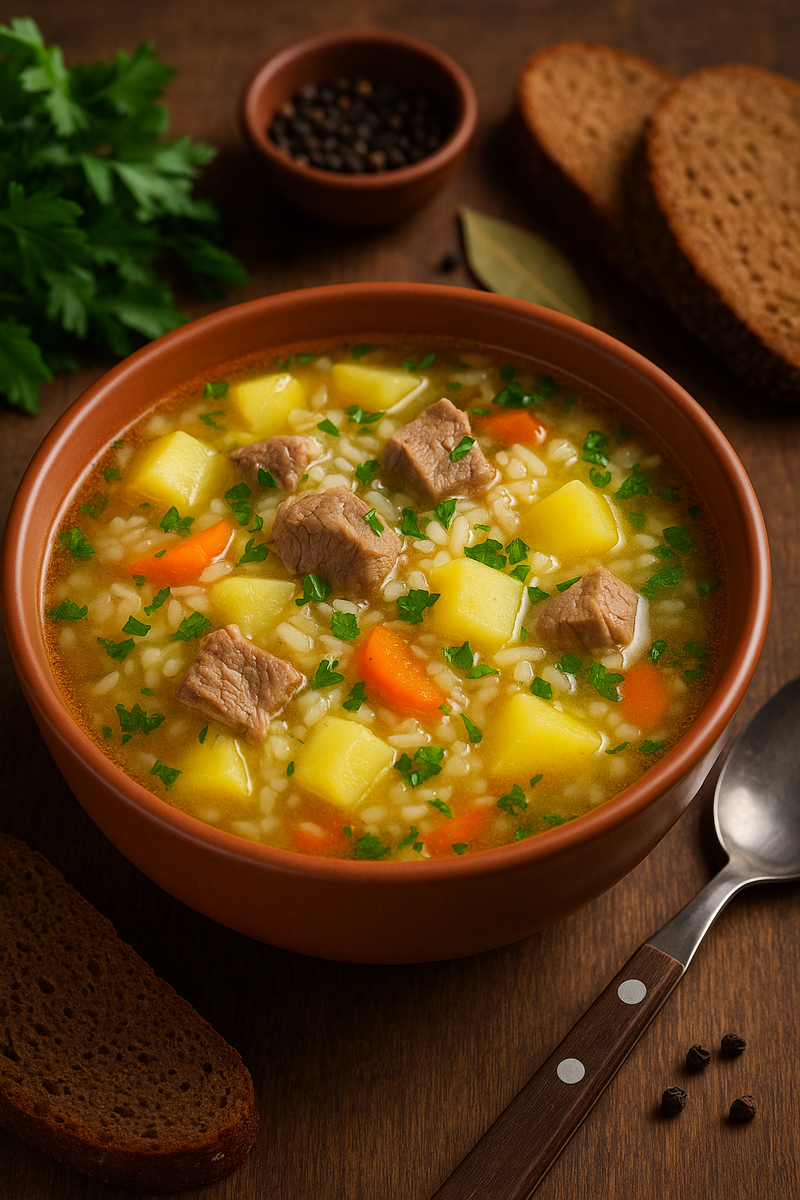 Суп — это не просто первое блюдо. Это уют в тарелке, ароматный привет из детства и символ домашнего уюта. Особенно если речь идёт о наваристом супе с мясом, картофелем и рисом. Сегодня делюсь подробным рецептом, который достоин постоянного места в вашем меню. Ни одного лишнего шага — всё продумано до мелочей. Пошагово, честно, с секретами, которые делают суп действительно незабываемым. Комбинация риса, картофеля и мяса — это всегда выигрыш. Сытно, сбалансировано и вкусно. Мясо придаёт насыщенность, рис делает текстуру мягкой, а картофель — плотной. Такой суп особенно хорош осенью и зимой, но летом он тоже хорош в прохладные дни. Вот точное количество, чтобы суп получился правильным — и не густым, как каша, и не водянистым. Мясо (на кости) — 500–600 г Лучше всего подойдёт говядина или куриные бедра. Можно использовать и свинину, если любите наваристее. Картофель — 4–5 средних клубня Около 500 г. Желательно использовать рассыпчатые сорта — они лучше отдают крахмал и создают нужную плот