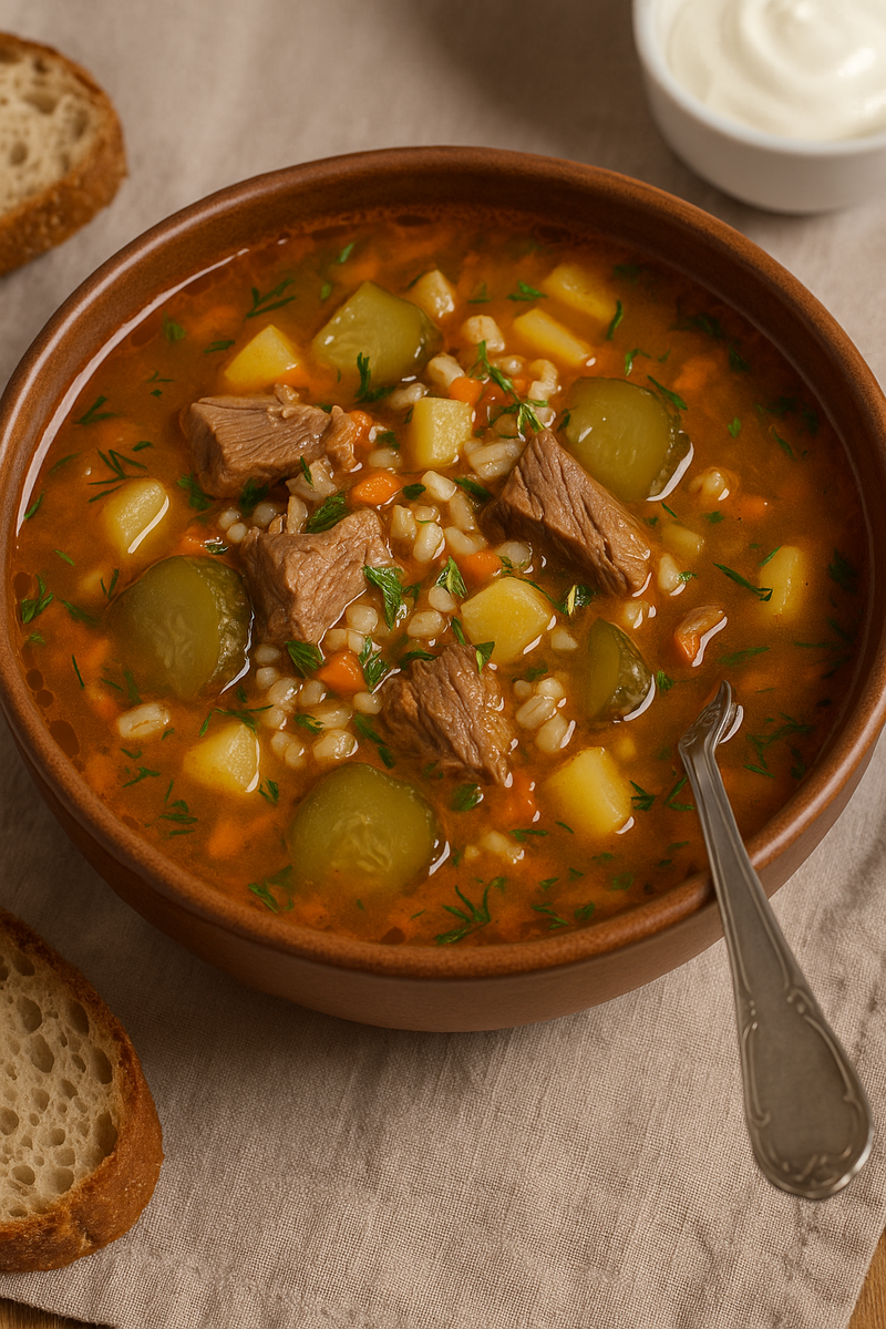 Рассольник — это не просто суп. Это душевное блюдо с историей, насыщенным вкусом и неповторимым ароматом, который невозможно спутать ни с чем. В этой статье я делюсь классическим рецептом рассольника с говядиной, перловкой и солеными огурцами. Мы не только подробно разберем каждый этап приготовления, но и раскроем все секреты, которые помогут вам сварить идеальный рассольник — такой, чтобы съесть ложку, и сразу захотеть вторую. Рассольник пришел к нам из глубины веков. Его прародителем считают «похлебку на рассоле» — любимое блюдо в крестьянских и купеческих домах Древней Руси. Основу всегда составляли мясной или рыбный бульон, соленые огурцы и рассол. Но именно в XX веке в рецептуру плотно вошла перловая крупа и говядина — так рассольник стал особенно питательным, сытным и сбалансированным. Секрет №1: перловку нужно готовить заранее. Это самая капризная часть рассольника, но и самая важная для текстуры. Отдельная варка избавит рассольник от лишней мутности и сделает бульон чистым и