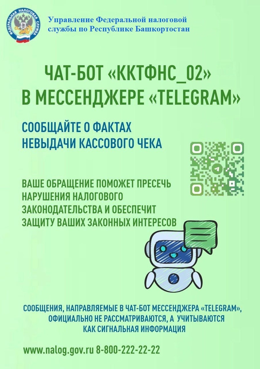 Сообщайте о фактах невыдачи кассового чека. Пользуйтесь чат-ботом «ККТФНС_02» в мессенджере «Telegram» по ссылке https://t.me/ККТcheckbot