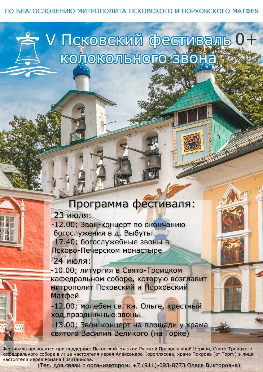23 и 24 июля 2025 года по благословению митрополита Псковского и Порховского Матфея в Псковской епархии пройдет V Псковский фестиваль колокольного звона, приуроченный ко дню памяти святой равноапостольной княгини Ольги.