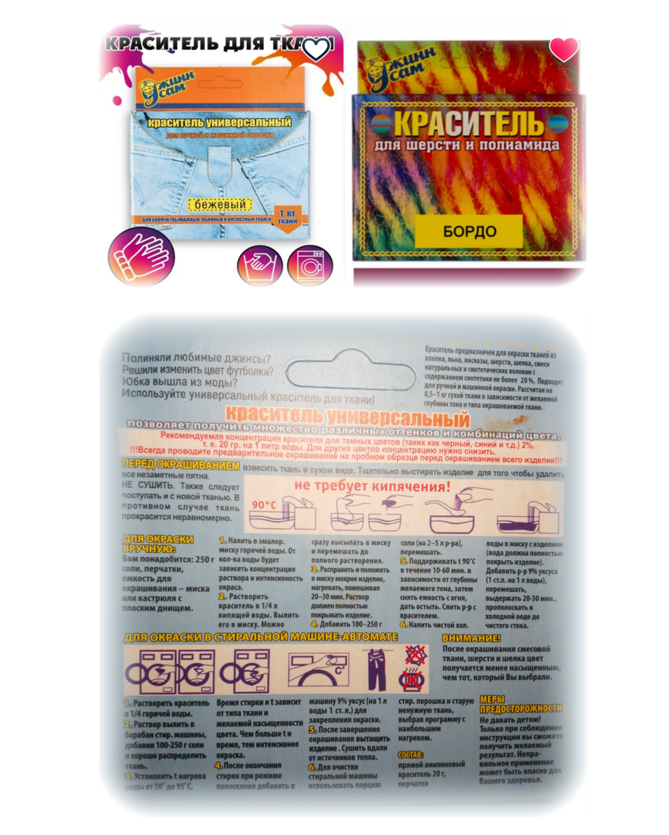 5. Краски есть универсальные, есть по типу ткани. На коробке указано, что чем выше температура и время окрашивания, тем интенсивнее цвет. Но надо понимать, что хлопок может сесть и обновленную кофточку придётся отдать соседкой дочке, а синтетика или шерсть стирку на 90 градусов просто не переживут. Мне повезло, у меня таких приключений не было, но скажу сразу покраска на 40 градусов не шибко эффективна. У меня был один опыт с такой температурой, но то была авантюра, страшно вспоминать 🙈 я покрасила новые ни разу не ношеные брюки от "Ой, девочки", я оказалась не готова к слишком красным штанам и решила их сделать бордовыми той самой краской, которую потом оттирала от резинки стиральной машины 🤦🏻♀️ сильных изменений не было, но брюки стали менее насыщенными и я начала их носить. Сейчас есть мысль купить проверенную краску и запустить их ещё на разок.