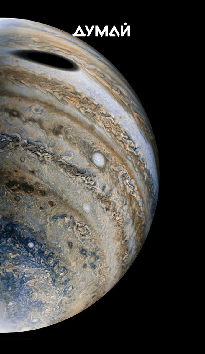 🌑 Тёмное пятно удалось запечатлеть благодаря космическому аппарату Juno («Юнона»). Juno изучает Юпитер уже 9 лет и сделала много удивительных снимков планеты-гиганта. Забавный факт: на борту находятся три фигурки лего — Галилео Галилея, римского бога Юпитера и его жены Юноны. В руках у Юноны находится увеличительное стекло, как символ поисков истины, у Юпитера — молния, а у Галилея — телескоп.