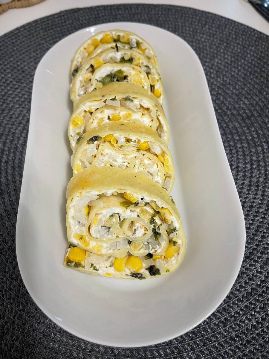 Яичный рулет Ингредиенты: Яйцо 4 шт Молоко 300 мл Мука 120 гр Соль и специи по вкусу Творожный сыр Начинка любая (я делала с кукурузой, луком и морской капустой🙈) Приготовление: Яйцо взбить с солью и специями, ввести молоко. Затем вводим муку, хорошо размешиваем. На противень выкладываем пергамент и смазываем маслом. Выливаем смесь и отправляем в духовку на 20-25 минут при температуре 180°. Даем немного остыть и смазываем творожным сыром. Выкладываем любую начинку, на ваш вкус. Заворачиваем и разрезаем на порционные кусочки. Приятного аппетита🌺 #яйцо #рулет #быстро #вкусно