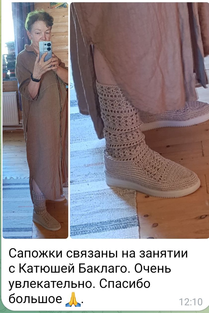 Ажурные сапоги, которые покорят всех вокруг! Каждый раз, когда вы будете выходить в этих сапожках, прохожие не могут отвести взгляд! А когда узнают, что вы связали их сами- это вызовет бурю эмоций и удивление: "Как? Вязаную обувь можно сделать своими руками? И так красиво?!" ✅ Комфортные- в них совсем не жарко, идеально для вечерних прогулок. ✅ Быстро вяжутся- готовая подошва ускоряет процесс. ✅ Универсальные- можно связать мокасины, ботиночки или ботфорты ✅ Экономичные- всего 100–150 г пряжи на пару. Из чего вязать? Подойдет лён, хлопок, смесовая пряжа или тонкий шнур- выбор за вами! Где взять подошву? Продается на любых маркетплейсах, уже подготовленная под провязывание. Остаётся только четко следовать инструкциям А сложно ли связать? Нет! Я продумала каждый этап так, чтобы даже новички справились без проблем. Никаких запутанных моментов- только удовольствие от вязания! . Готовы удивлять прохожих и наслаждаться летними променадами в эксклюзивной обуви? 🚀 ✨Оформить МК можно на