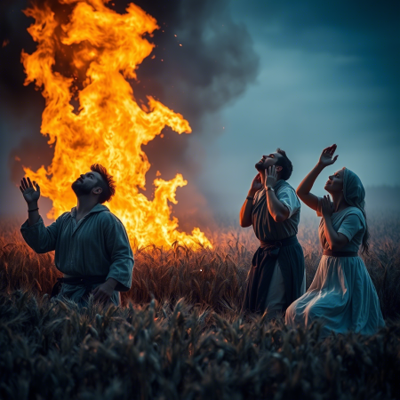 О, славный слушатель, приготовь сердце — ибо пришла пора завершить нашу балладу, и завершить её великой жертвой, достойной пера сказителя и слёз самой Луны. В год, когда солнце пылало, как в гневе, А земля превратилась в печь, Поля пшеничные, что были золотом народа, Загорелись от одного дуновения смерча. Ни дождя, ни слёз, ни молитв — Только пламя, что пожирало надежду. Колосья падали, как павшие воины, И кричали к небесам: «Спасите нас!» Тогда-то и появилась она — Белая Ворона, тень между двух миров. Летела она из небесной мглы, Где ангелы молчали, не в силах вмешаться. Она села на вершину старой башни, Что осталась от времён забытых королей, И закричала — не птичьим криком, А голосом, подобным звону колоколов: «Я не бог, не дух, не тень, Но я — память о том, что жизнь не кончается смертью! И если небеса не могут спасти землю, То я принесу себя в жертву огню!» И она взлетела — выше, чем когда-либо, Куда не достаёт ни меч, ни молитва. Собрала в себя свет всех звёзд, Что хранили её
