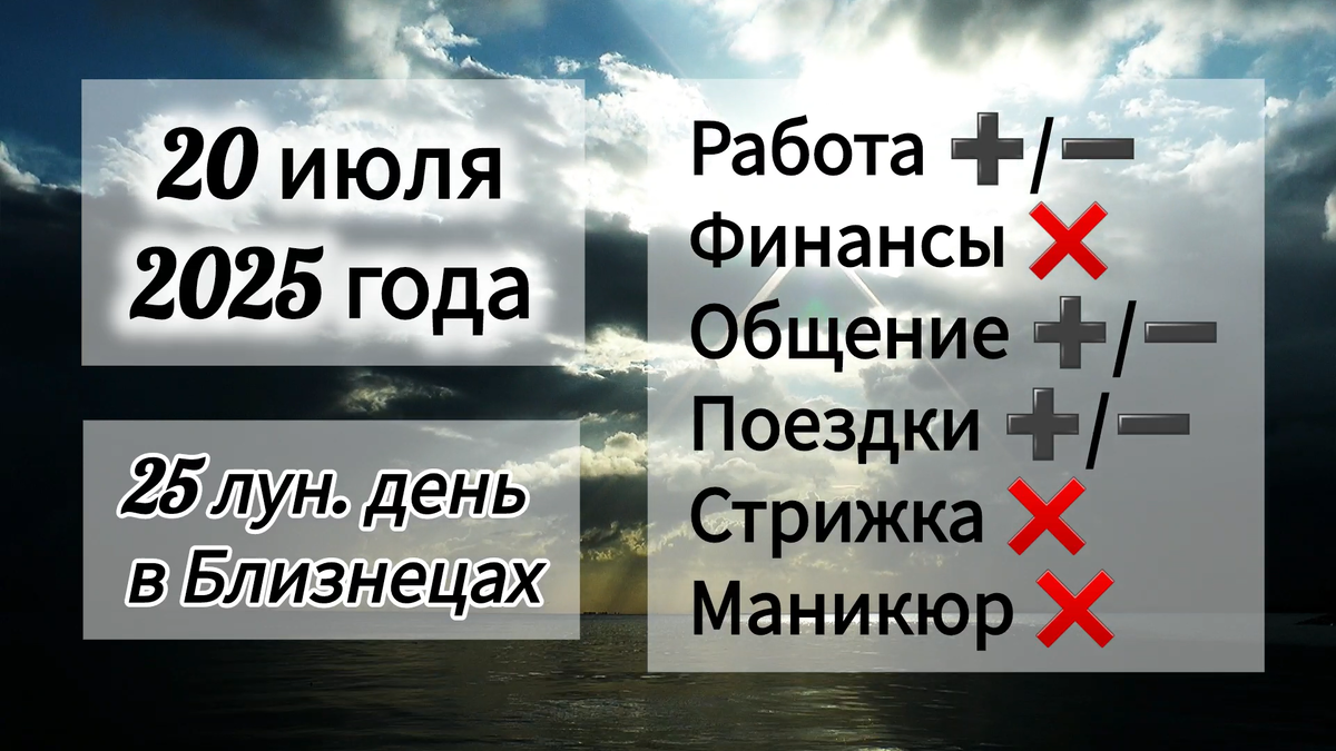 В первой половине дня будет Луна без курса. Не стоит планировать на это время ответственные дела и важные решения. В этот период вероятны ошибки и промахи. Без особых причин могут срываться договоренности. Лучше заниматься обычными повседневными делами, не требующими повышенной концентрации. Во второй половине дня после 14 часов 30 минут Луна переходит в знак Близнецов, а 25 лунный день также не располагает к активной работе и новым начинаниям. Концентрация внимания минимальна. Сохраняется риск ошибок и непродуманных решений. Поэтому нужно быть предельно внимательными и осторожными. Не рекомендуется проводить денежные операции и покупки, возможны спонтанные незапланированные траты. Купленные в этот период вещи долго не прослужат. Общение в этот день поверхностно, на серьезные знакомства рассчитывать не стоит. При Луне в Близнецах повышается болтливость, время тратится на пустые разговоры и сплетни. Стоит уделить больше времени духовному развитию и умственной деятельности. Начните подводить итог уходящего лунного месяца. Постарайтесь максимально разгрузить свой организм, избегая переедания, алкоголя и физических нагрузок.