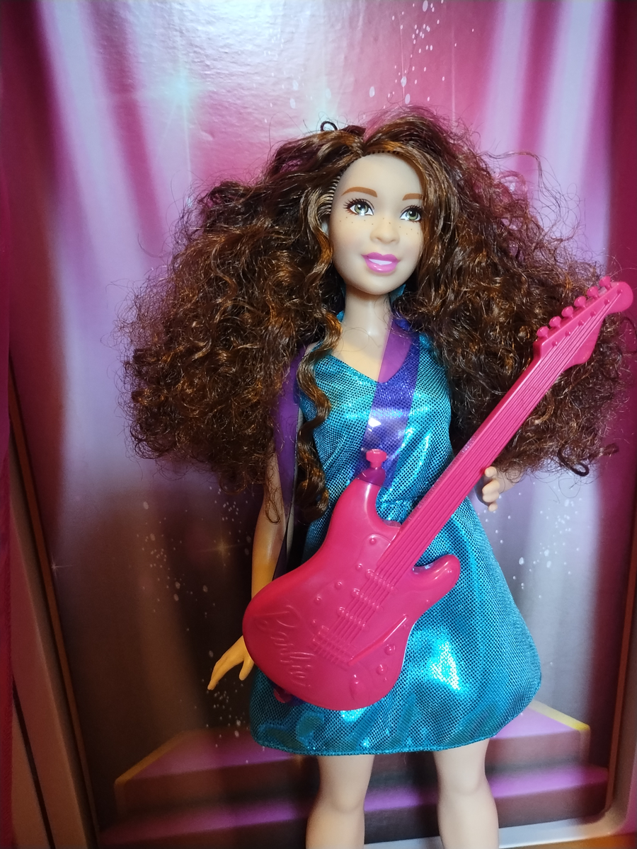 Всем доброго дня! Продолжаю показывать мою коллекцию кукол Барби. Сегодня вашему вниманию музыкальная подборка, две Барби Pop star Сначала девушка с гитарой. Она поп-певица, поющая песни своего сочинения Эта Барби- пышка, с красивой боди позитивной фигурой в блестящем голубом платье. Улыбчивая веселая девшука с копной кудрявых каштановых волос. И конечно, с гитарой, модного розового цвета. Как и положено певице- она стоит на сцене и поет для вас. Зеленоглазая веснушчатая шатенка А вот как эта Барби выгоядит в оригинале ************************************************************************* Вторая Барби поп-стар, у нее красивый серебристый наряд, сиреневые волосы и микрофон в виде розы. (Это я так придумала, просто оригинальный микрофон потерялся) И вот как она выглядит в оригинале. Микрофон у нее высокий, на стойке. Вот такие две куколки сегодня. А у кого еще есть такие Барби? - Всегда благодарна за лайки и комментарии