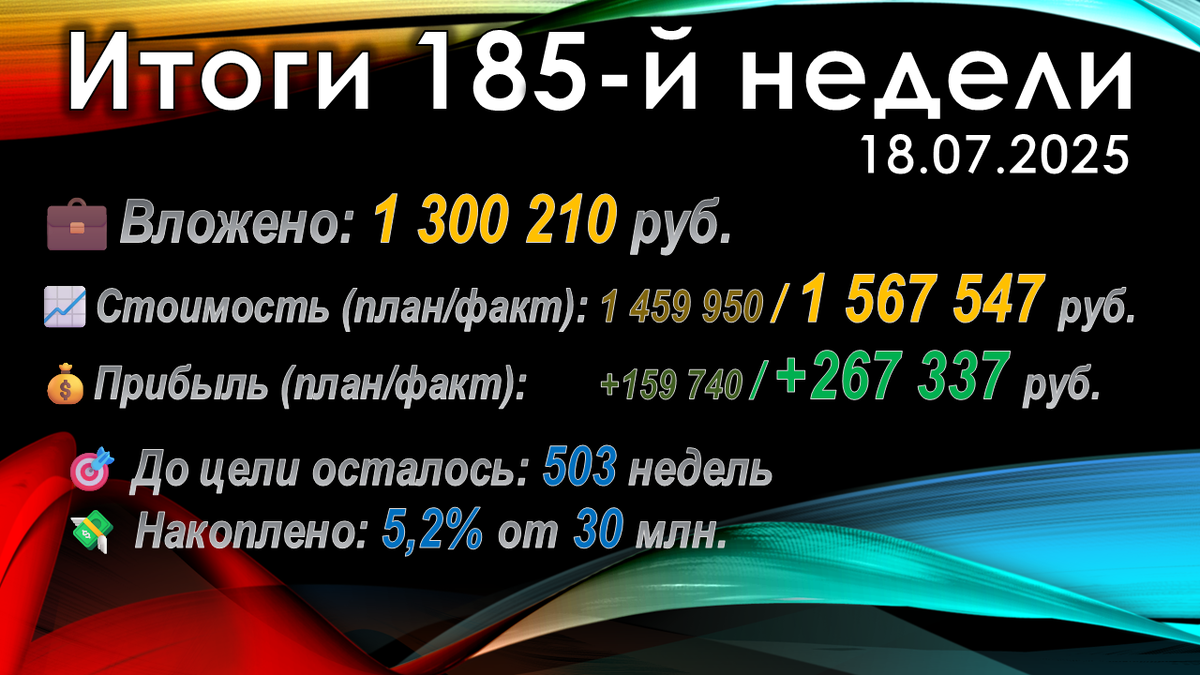 На прошедшей неделе российский рынок совершил мощный рывок: индекс Мосбиржи вырос на +6,1%, преодолев ключевой уровень сопротивления и закрывшись на 2784 пунктах. Но главное - мой портфель установил исторический рекорд с приростом +84`341 руб., превзойдя предыдущее достижение (+67`188 руб. на 163-й неделе)!