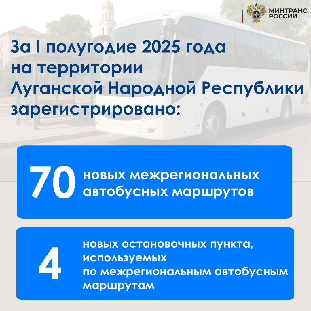 Итоги первого полугодия 2025 года: новые межрегиональные автобусные маршруты и остановочные пункты на территории ЛНР За 6 месяцев текущего года на территории Донецкой Народной Республики зарегистрировано 70 новых регулярных межрегиональных автобусных маршрутов, а также 4 остановочных пункта, используемых по межрегиональным автобусным маршрутам. Росавтотранс на постоянной основе оказывает информационную поддержку профильным организациям субъектов Российской Федерации по вопросам установления новых маршрутов, а начало рейсовой работы по новым маршрутам позволит пассажирам выбрать удобное время отправления автобуса. ————— Поддержите канал Подпиской на "Сыны Отечества" или Голосом за канал ✅ подписаться |⚡️проголосовать 📲Наш проект в социальных сетях: Вконтакте, Одноклассники, Дзен, RuTube