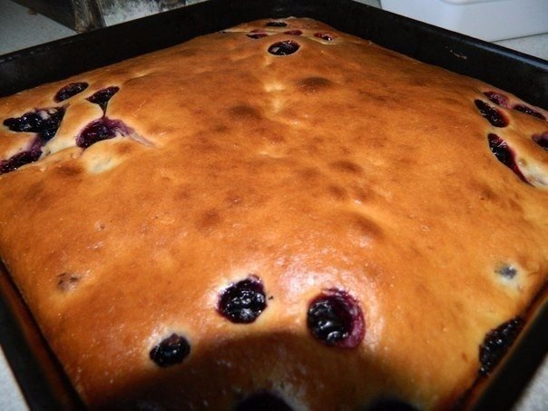 Яйца растереть с сахаром, затем добавить сметану, соду и муку. Муку добавляю постепенно, масса должна быть как на оладьи… Может быть потребуется и меньше стакана. Половину массы вылила в форму, затем положила замороженную черную смородину и залила оставшейся массой…минут на 30 в духовку и можно кушать.