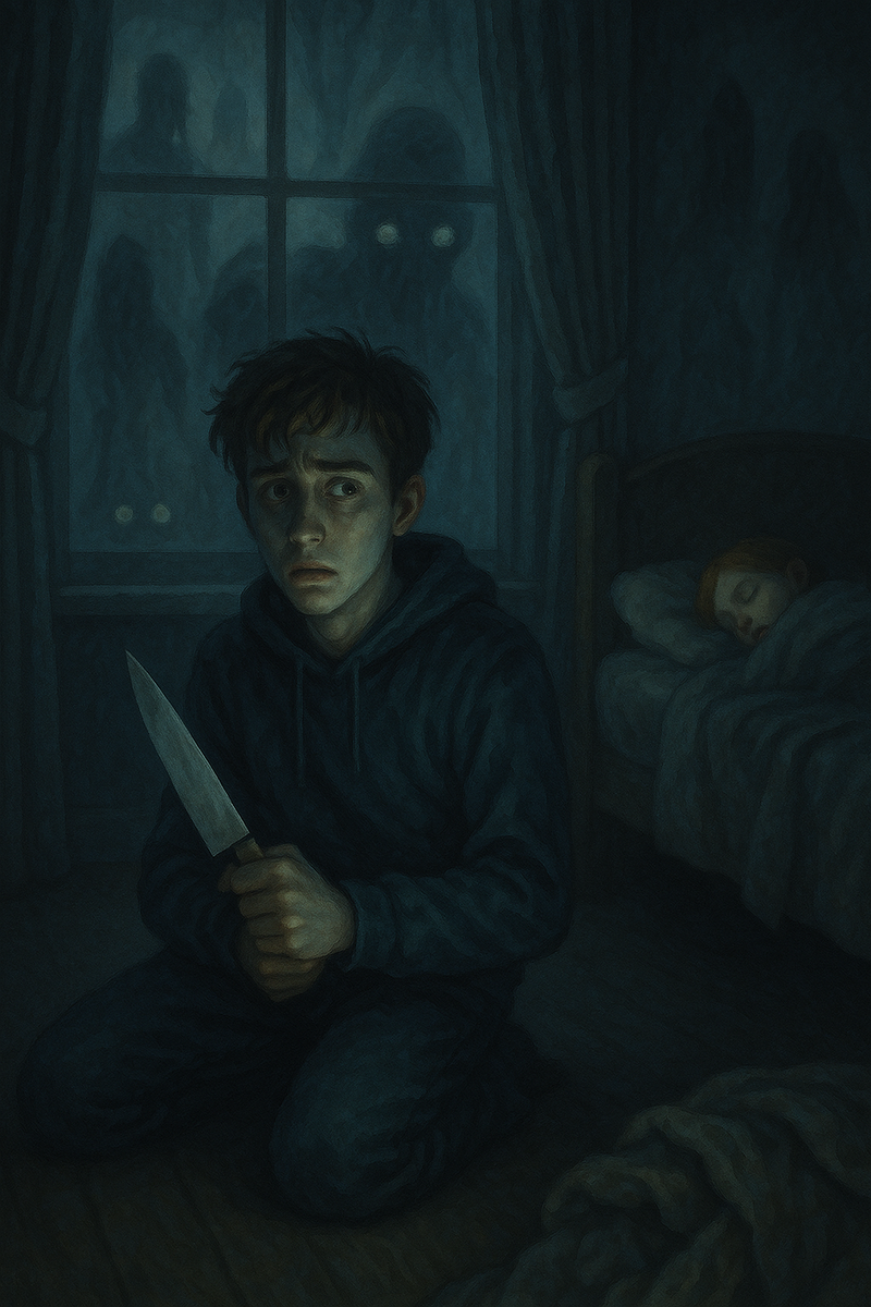 Я задвинул шторы. Потом... раздался голос. Голос аллигатора, глубокий, как вибрация из самой воды. Я схватил Мэйзи и побежал в свою комнату. Закрыл окно шкафом. Уложил Мэйзи на кровать. Сам лёг на пол у двери с кухонным ножом. Слушаю. Слышу голоса Франсин и Джонсов за окном её комнаты.