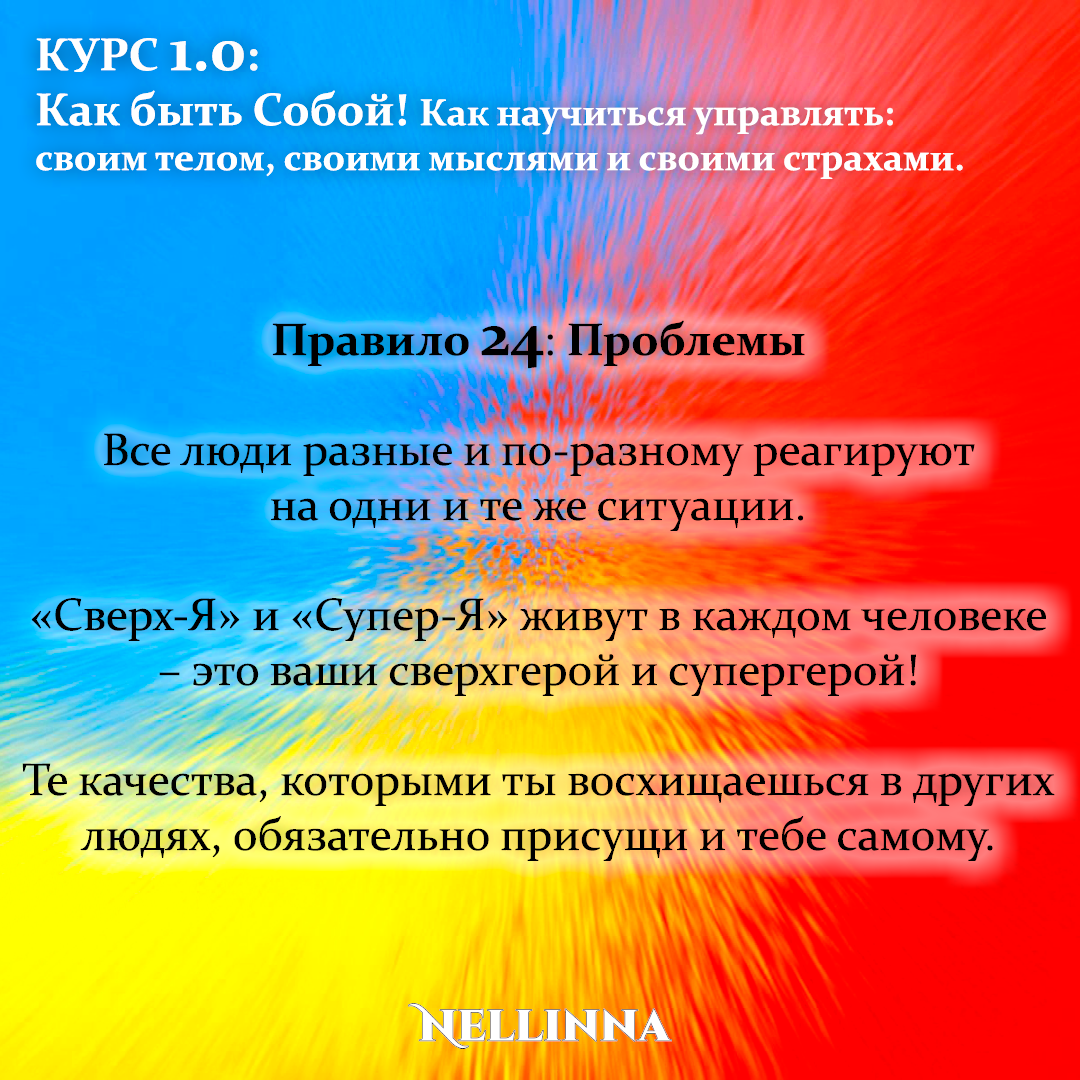Правило 24: Все люди разные и по-разному реагируют на одни и те же ситуации. «Сверх-Я» и «Супер-Я» живут в каждом человеке – это ваши сверхгерой и супергерой! Те качества, которыми ты восхищаешься в других людях, обязательно присущи и тебе самому. И в тебе кроется огромный потенциал - мудрость, деловая смекалка, милосердие, выносливость или предприимчивость. Осталось только выпустить данный потенциал на свободу и позволить внутренним резервным качествам проявиться. Чтобы не пропустить следующую публикацию – Подписывайтесь! И делитесь полезной и бесплатной информацией! #курс #тренинг #обучение #практикум