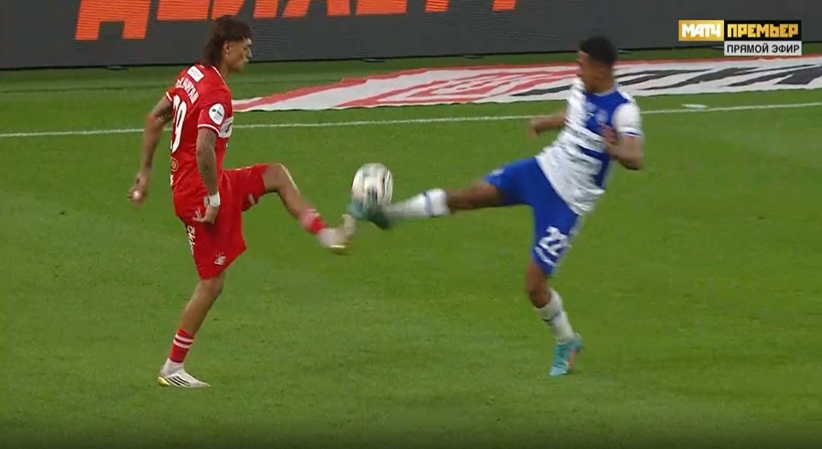 Спартак-Динамо Мх Ошибается Казарцев и ошибочно показывает 2-ю ж.к игроку Динамо №22 за грубую игру. Оба игрока тянутся к мячу и хотят сыграть в мяч, игрок Динамо не успевает и носком бутсы попадает по носку бутсы игрока команды Спартак. Фол да, штрафной да, но 2-я ж.к и удаление. Правильное решение: Штрафной удар
